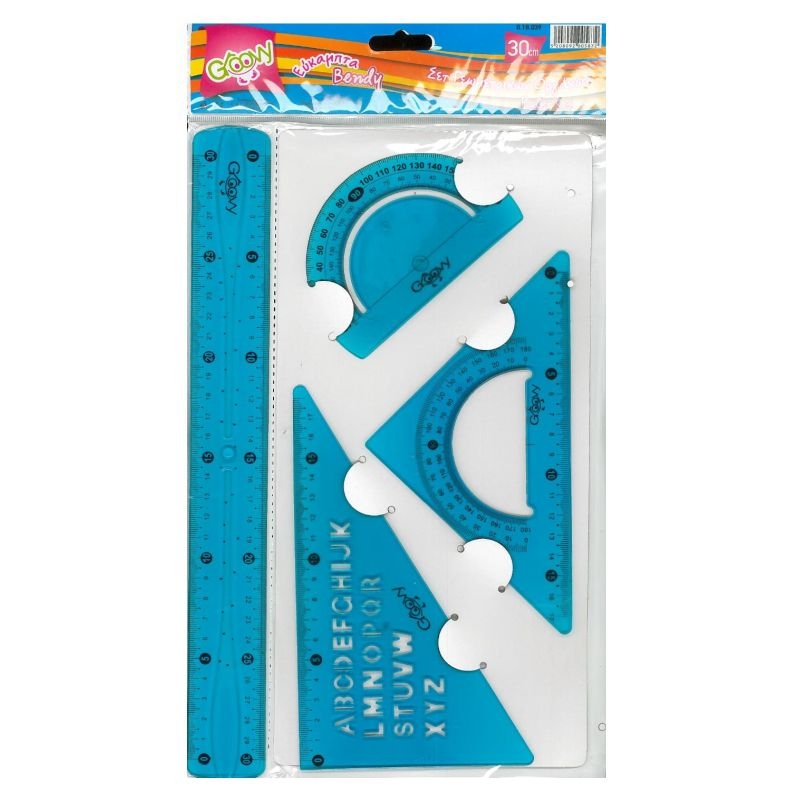 Σετ γεωμετρικών οργάνων 4 τεμαχίων. Διάσταση χάρακα 30 εκατοστά. Περιέχει επίσης 2 τρίγωνα και ένα μοιρογνωμόνιο.
