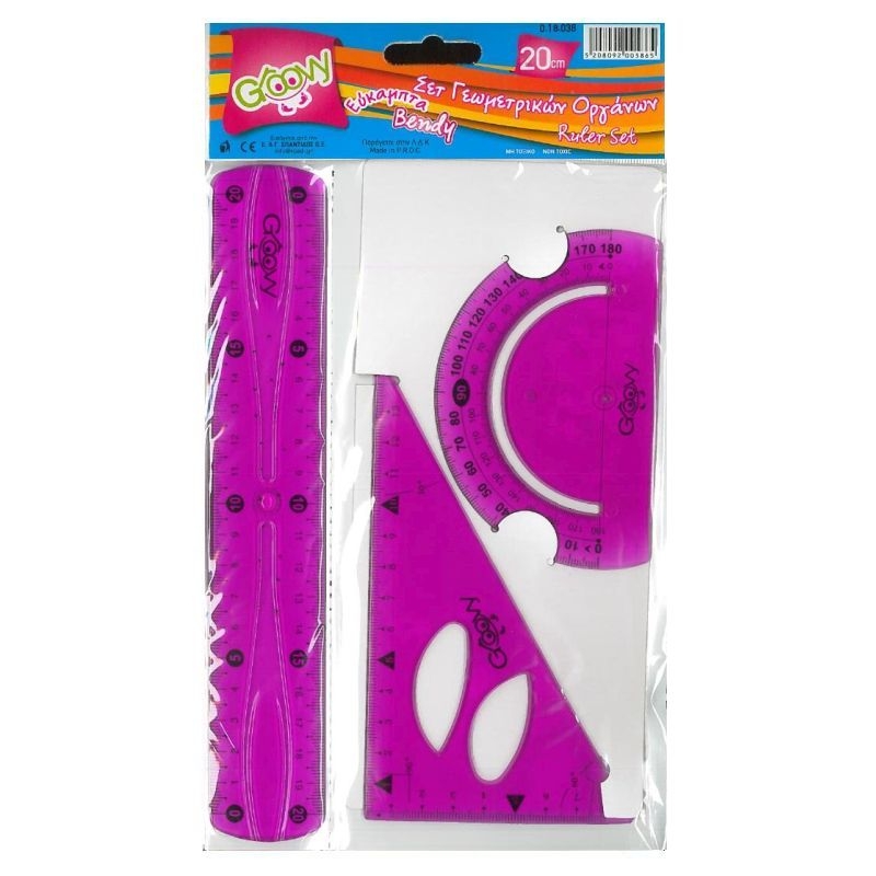 Σετ γεωμετρικών οργάνων 3 τεμαχίων. Διάσταση χάρακα 20 εκατοστά. Περιέχει επίσης ένα τρίγωνο και ένα μοιρογνωμόνιο.
