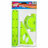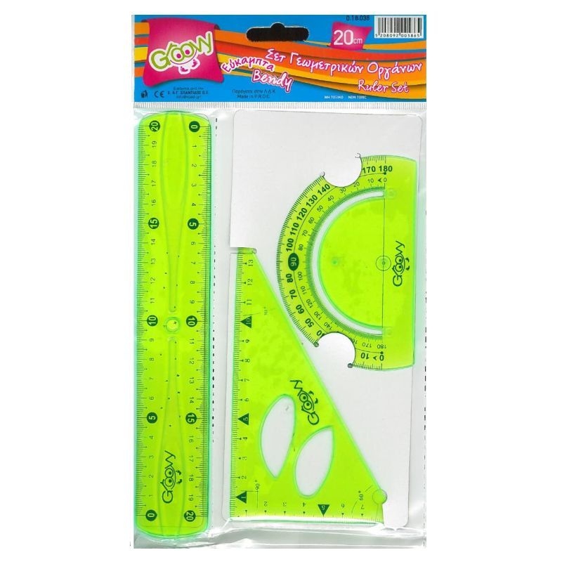 Σετ γεωμετρικών οργάνων 3 τεμαχίων. Διάσταση χάρακα 20 εκατοστά. Περιέχει επίσης ένα τρίγωνο και ένα μοιρογνωμόνιο.