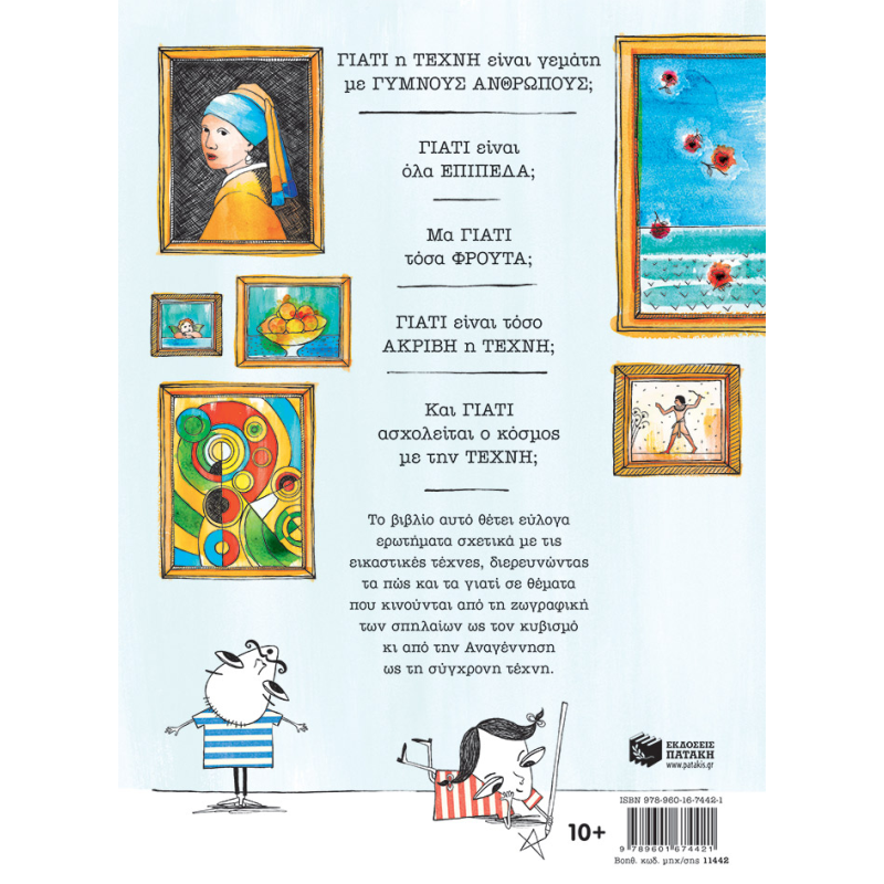 Γιατί η τέχνη είναι γεμάτη με γυμνούς; Ένα βιβλίο οδηγός για όλες τις μορφές τέχνης, από την αρχαιότητα, με τη ζωγραφική των σπηλαίων, μέχρι σήμερα, με τις εγκαταστάσεις από τεχνητά σύννεφα μέσα σε κλεισμένα περίεργα δωμάτια. Μα γιατί τόσα φρούτα; Τι είναι αυτό που βλέπω ακριβώς; Γιατί να ζωγραφίσει κάποιος τη θέα; Το βιβλίο αυτό ενθαρρύνει τους νεαρούς αναγνώστες να εκφράσουν άφοβα και τις πιο απλές ιστορίες πέρι τέχνης και να βρουν απαντήσεις, παραδείγματα και εν τέλει να νιώσουν ότι δεν είναι οι μόνοι που έχουν απορίες! Με την εξαιρετική επιλογή των έργων που έχει κάνει η συγγραφέας, δείχνει με ποιους τρόπους και μορφές τέχνης, η ίδια θεματολογία έχει απασχολήσει καλλιτέχνες από διαφορετικές εποχές και χώρες.