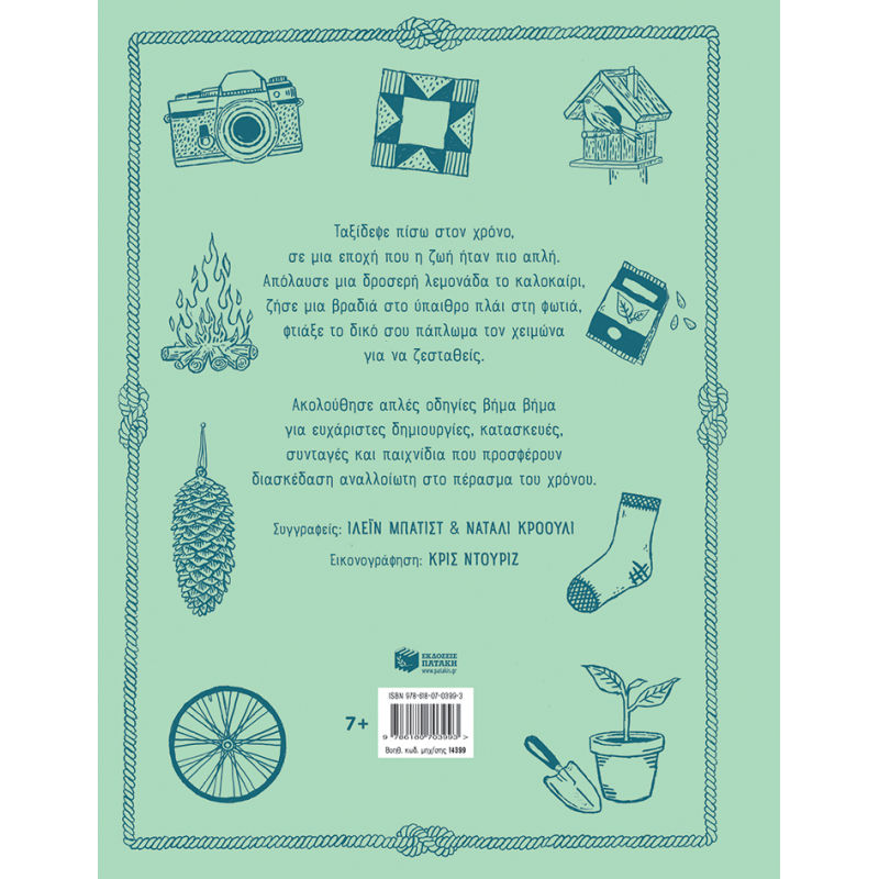 Ταξίδεψε πίσω στον χρόνο, σε μια εποχή που η ζωή ήταν πιο απλή. Απόλαυσε μια δροσερή λεμονάδα το καλοκαίρι, ζήσε μια βραδιά στο ύπαιθρο πλάι στη φωτιά, φτιάξε το δικό σου πάπλωμα τον χειμώνα για να ζεσταθείς. Ακολούθησε απλές οδηγίες βήμα βήμα για ευχάριστες δημιουργίες, κατασκευές, συνταγές και παιχνίδια που προσφέρουν διασκέδαση αναλλοίωτη στο πέρασμα του χρόνου.