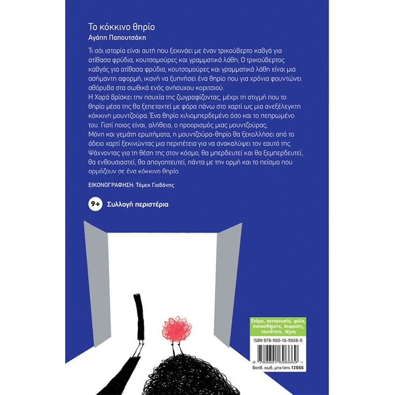 Μόνη και γεμάτη ερωτήματα, η μουντζούρα-θηρίο θα ξεκολλήσει από το άδειο χαρτί ξεκινώντας μια περιπέτεια για να ανακαλύψει τον εαυτό της. Ψάχνοντας για τη θέση της στον κόσμο, θα μπερδευτεί και θα ξεμπερδευτεί, θα ενθουσιαστεί, θα απογοητευτεί, πάντα με την ορμή και το πείσμα που αρμόζουν σε ένα κόκκινο θηρίο.
