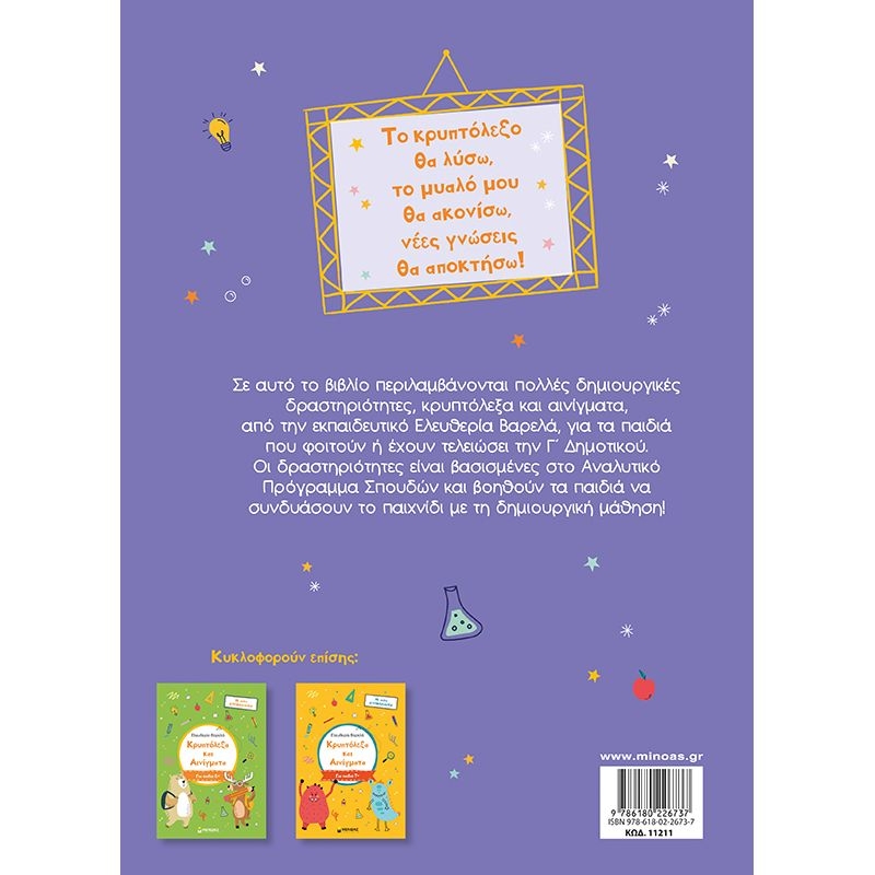 Σε αυτό το βιβλίο περιλαμβάνονται πολλές δημιουργικές δραστηριότητες, κρυπτόλεξα και αινίγματα,