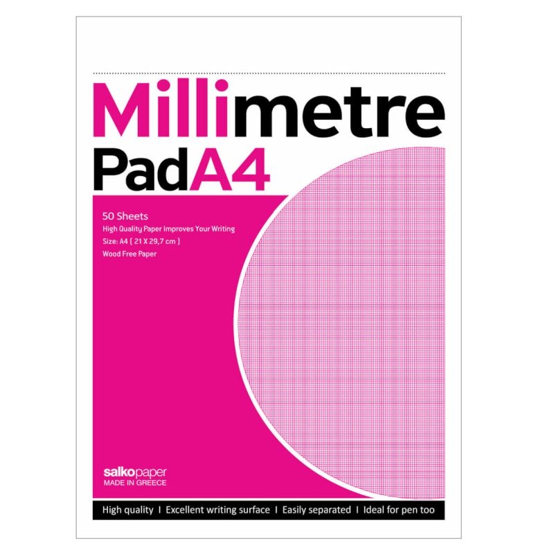 Μπλοκ γραφής μιλιμετρέ  από την Salko . Λειτουργικό, με εξώφυλλο που προς τα πάνω για διάφορες χρήσεις. Κατάλληλο για μαθητές και φοιτητές καθώς είναι ιδανικό για σχήματα γεωμετρίας και σημειώσεις
