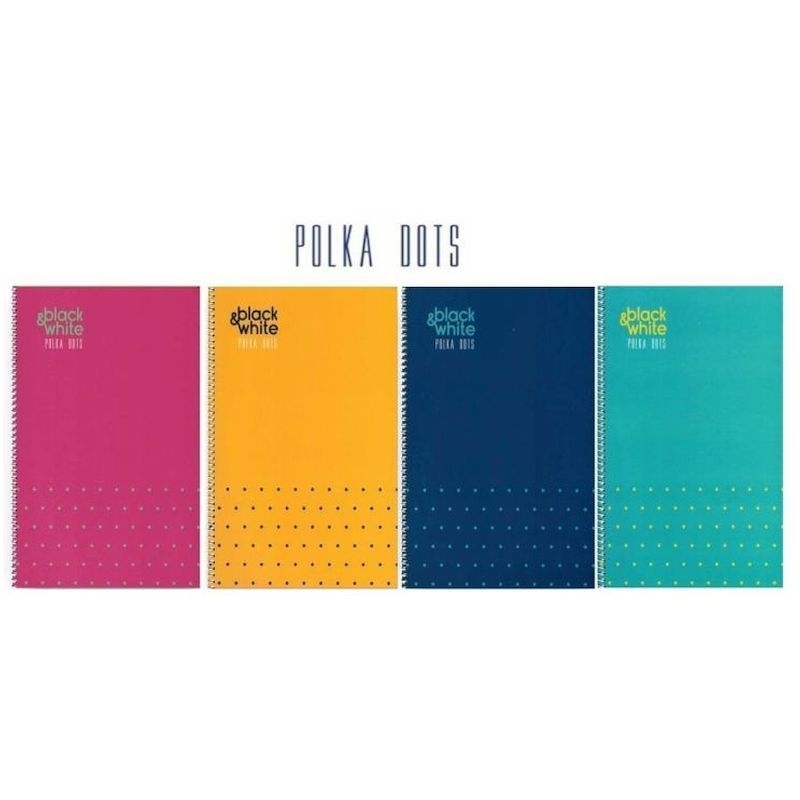 Τετράδιο σπιράλ 2 θεμάτων της σειράς Polka Dots από την Black&White σε 4 σχέδια. Διαθέτει εξώφυλλο από σκληρό χαρτόνι και 60 ριγέ φύλλα 70gr.