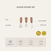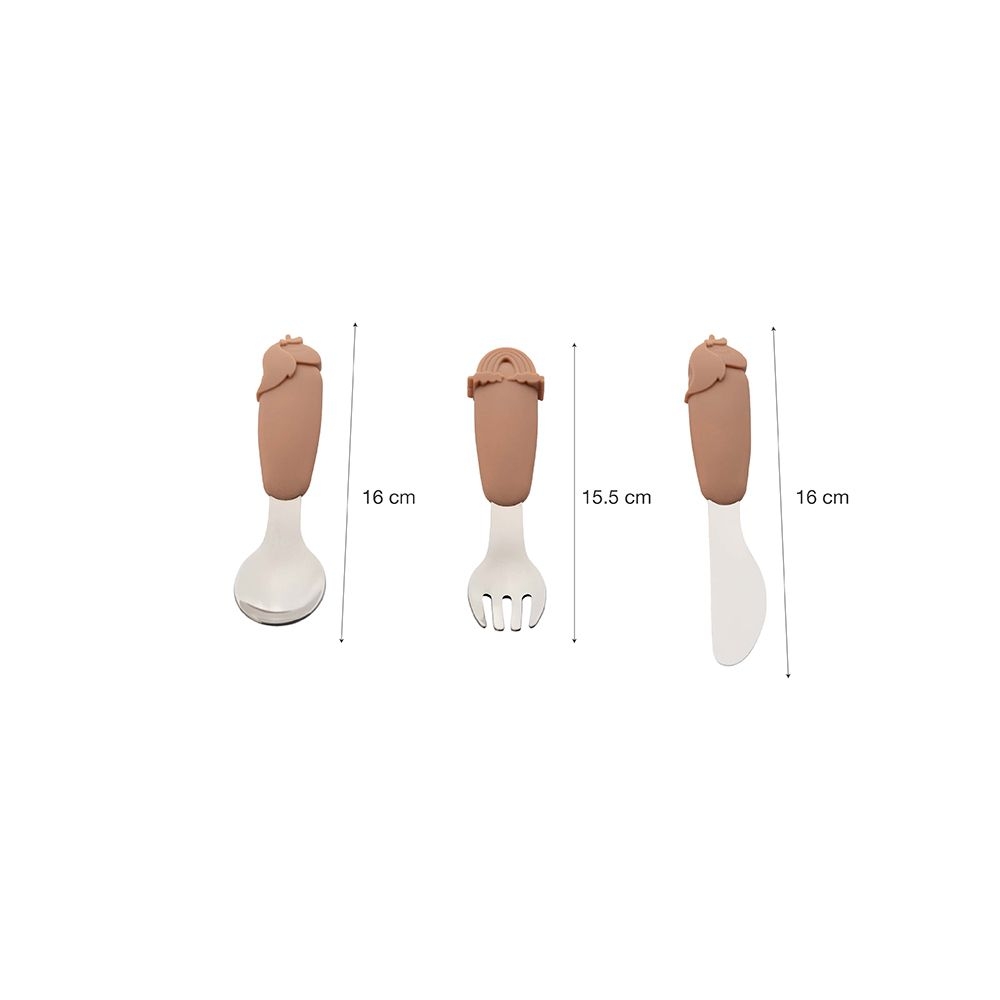 Σετ μαχαιροπίρουνων από ανοξείδωτο ατσάλι 304 και λαβές από σιλικόνη, ιδανικό για να ξεκινήσουν τα μικρά παιδιά να τρώνε μόνα τους. Τα μαχαιροπίρουνα είναι ελαφριά, ανθεκτικά και κατασκευασμένα από βιώσιμα υλικά, χωρίς τοξικά. Στη συσκευασία περιλαμβάνονται κουτάλι, πιρούνι και μαχαίρι.