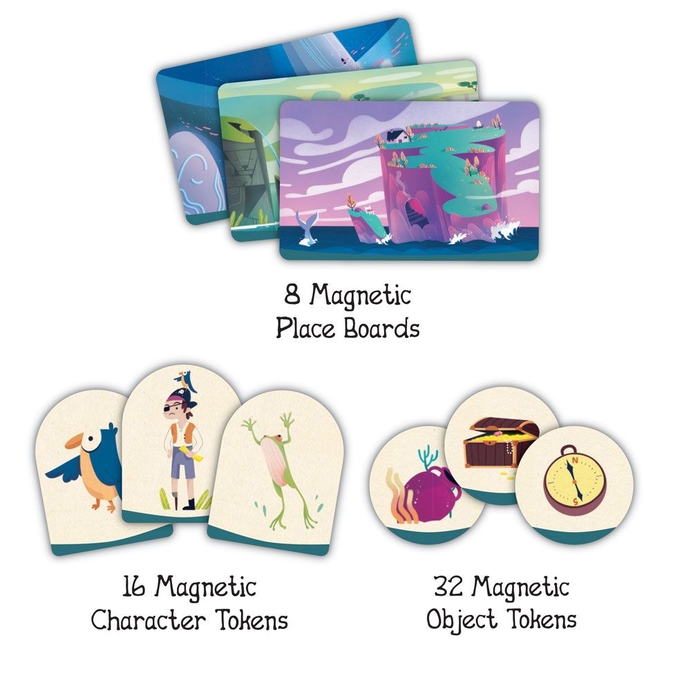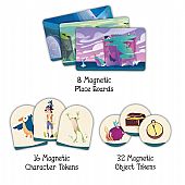 Περιλαμβάνει: 8 μαγνήτες με τοποθεσίες, 16 με χαρακτήρες και 32 με αντικείμενα, 1 θήκη, 1 μαρκαδόρο γράψε-σβήσε.