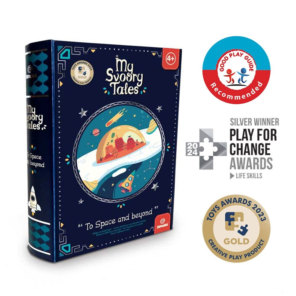 Ταξιδέψτε στον υπέροχο κόσμο της έμπνευσης και αφήγησης των παραμυθιών με το παιχνίδι «SvooryTales»! Ένα πρωτότυπο και άκρως δημιουργικό παιχνίδι που ακολουθεί τη σχεδιαστική δομή ενός παραδοσιακού vintage βιβλίου. Στο εσωτερικό του υπάρχουν 3 σελίδες οι οποίες αντιστοιχούν στα 3 στάδια αφήγησης: Εισαγωγή, Προϊδέαση-Διήγηση και Λύση. Στη συσκευασία περιλαμβάνονται μαγνήτες που μπορούν να επιλεγούν τυχαία και να τοποθετηθούν σε αυτές τις σελίδες. Με βάση τα εικονιζόμενα στοιχεία ο αφηγητής δημιουργεί διάφορες ιστορίες, η καθεμία με τη δική της ξεχωριστή πλοκή ή με αμέτρητες εναλλακτικές εκδοχές! Με αυτόν τον τρόπο, καλλιεργείται η προσδοκία στους μικρούς ακροατές να περιμένουν κάτι μαγικό να συμβεί, που σίγουρα δεν θα είναι ποτέ το ίδιο καθώς οι δυνατότητες της ιστορίας είναι άπειρες! Είναι ιδανικό για παιδιά άνω των 3 ετών ενώ ταυτόχρονα αποτελεί ένα πολύ χρήσιμο εργαλείο για γονείς, εκπαιδευτικούς, συμβούλους και λογοθεραπευτές. Εξαιρετικά πρωτότυπο, κατασκευασμένο από ασφαλή υλικά και με μοντέρνες πινελιές στο σχεδιασμό του, περιέχει 8 μαγνήτες με τοποθεσίες, 16 με χαρακτήρες και 32 με αντικείμενα, που βρίσκονται με ασφάλεια αποθηκευμένοι σε βαμβακερή θήκη. Περιλαμβάνεται επίσης ένας γράψε-σβήσε μαρκαδόρος που καθιστά δυνατή τη γραφή στις σελίδες με τις γραμμές όλων των φανταστικών ονομάτων αλλά και των επιμέρους χαρακτηριστικών των εικόνων.
