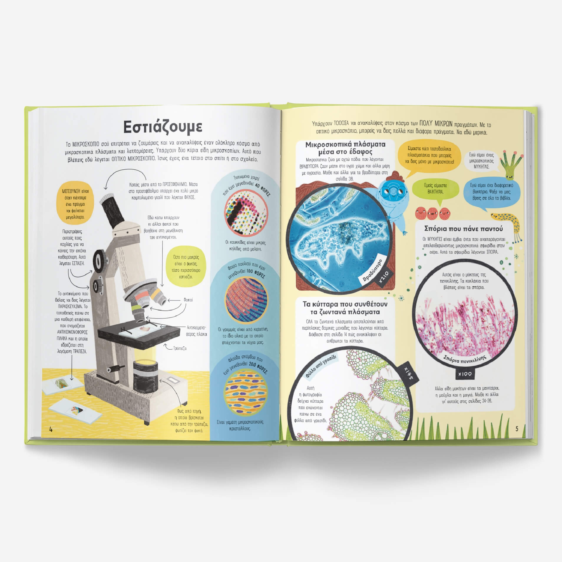 Ταξίδεψε με το μικροσκόπιο σε έναν κόσμο αόρατο αλλά πέρα για πέρα αληθινό. Στο βιβλίο αυτό σε περιμένουν συναρπαστικές γνώσεις, μαγικές φωτογραφίες και δραστηριότητες που μπορείς να κάνεις με ένα μικροσκόπιο ή έναν μεγεθυντικό φακό.