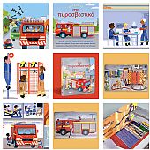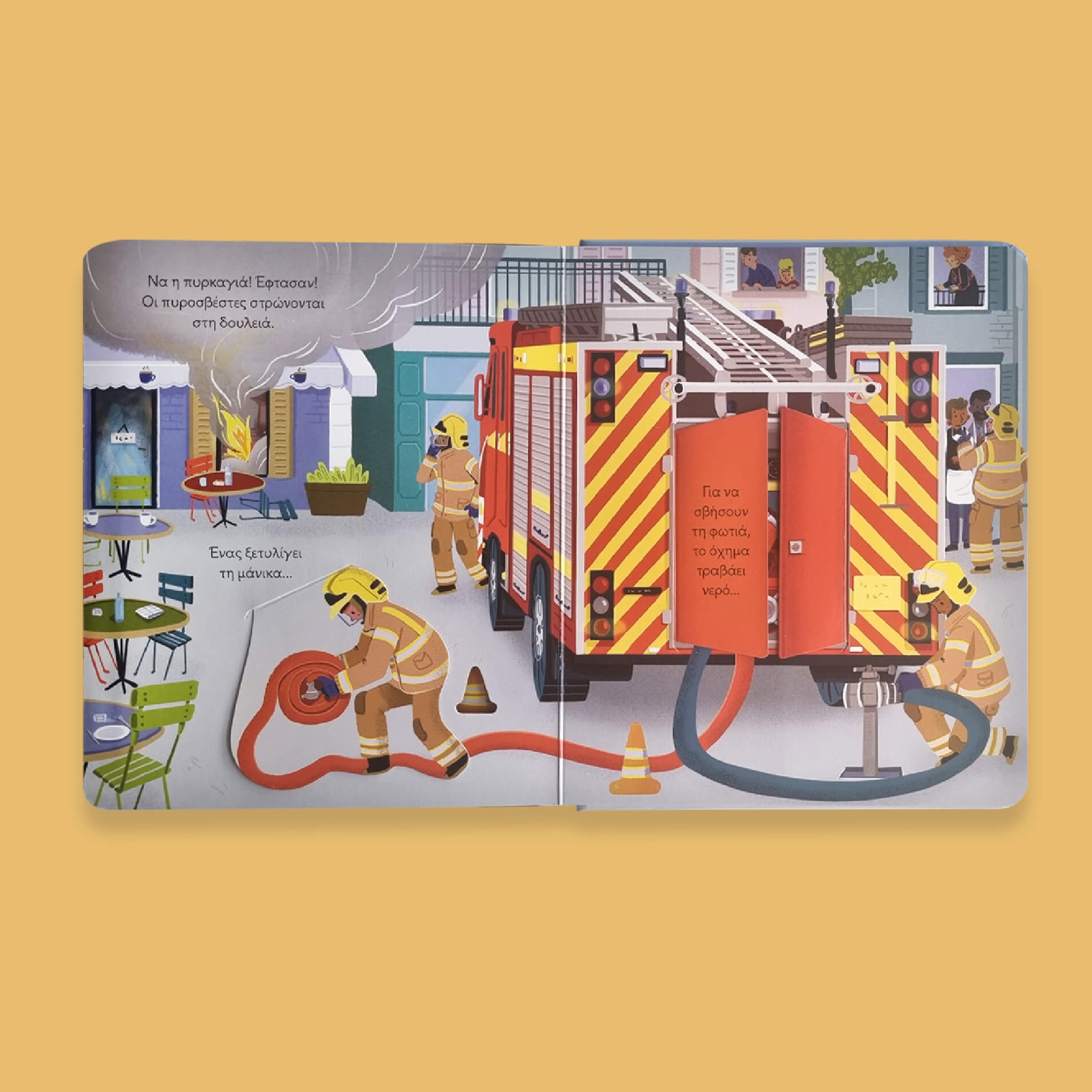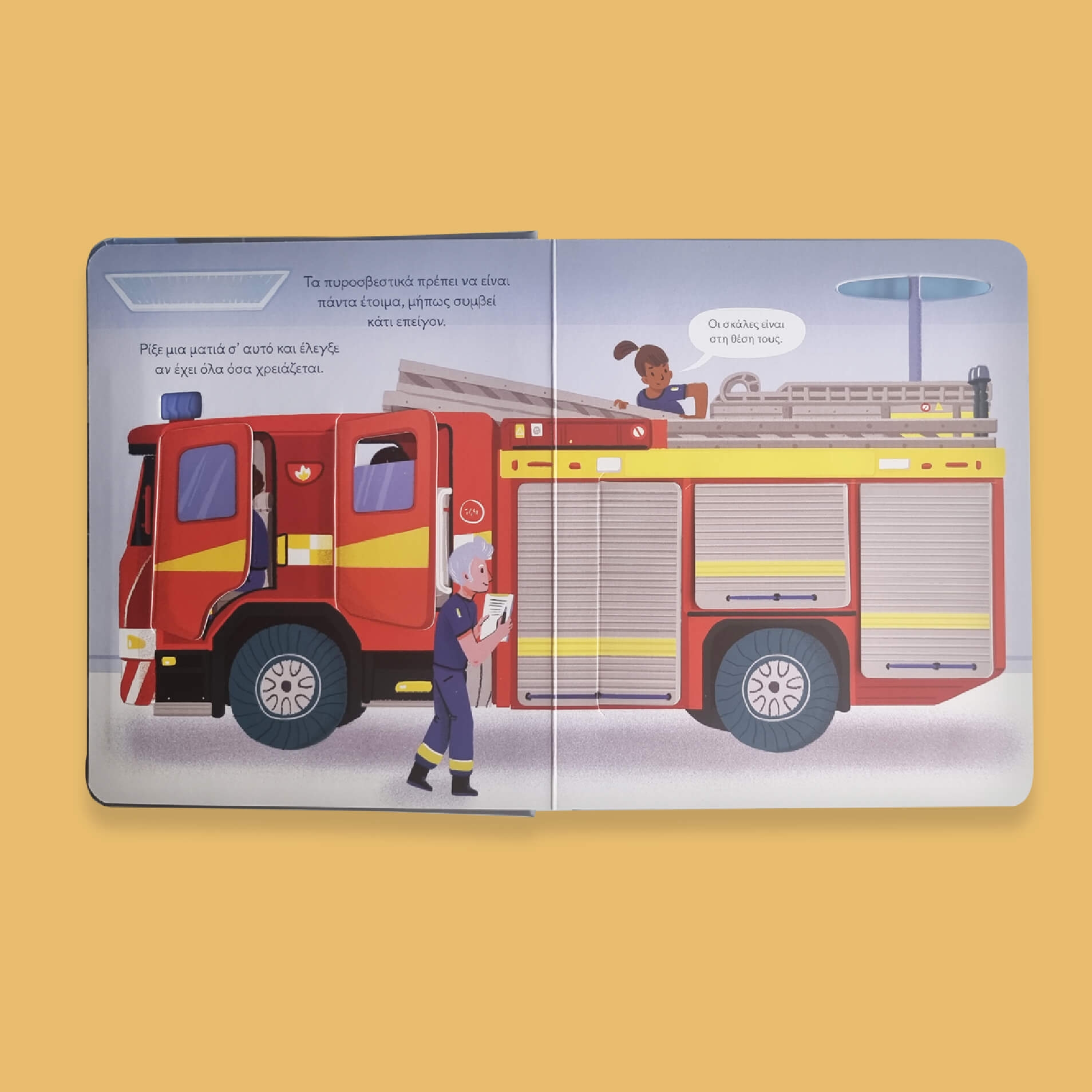 Γρήγορα! Ξέσπασε πυρκαγιά και το πυροσβεστικό πρέπει να τη σβήσει! Ρίξε μια ματιά στην καμπίνα, ξετύλιξε τις μάνικες και σήκωσε τη σκάλα για να δεις πώς λειτουργεί.