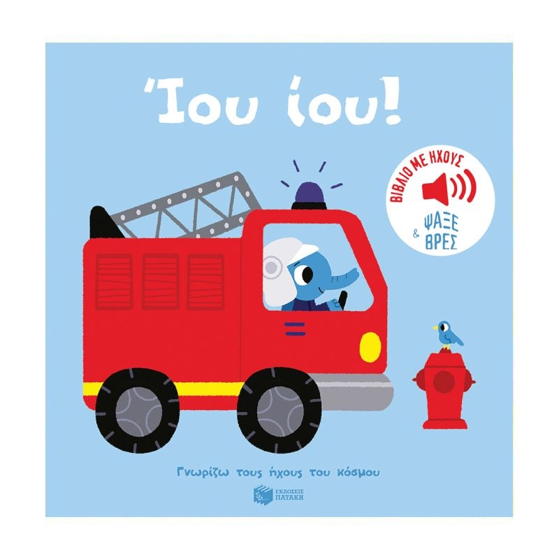 Ο συναγερμός χτυπάει στον πυροσβεστικό σταθμό. Αυτό είναι το σήμα για να ξεκινήσετε! Ίου, ίου! Αφήστε το πυροσβεστικό όχημα να περάσει! Οι ήχοι, προσεκτικά επιλεγμένοι, εμπλουτίζουν κάθε σκηνή για να την κάνουν ακόμα πιο ζωντανή. Και στο τέλος, ένα παιχνίδι αναζήτησης και εύρεσης ήχου με ένα κουμπί-έκληξη! Το παιδί πατάει το κουμπί και δείχνει την εικόνα που ακούει. Πατάει ξανά και ψάχνει σε ποια εικόνα αντιστοιχεί ο νέος ήχος και αυτό, όσες φορές θέλει! Εδώ και χρόνια οι Εκδόσεις Πατάκη πρωτοπορούν στην κατηγορία των ηχητικών βιβλίων με μια μεγάλη συλλογή διαλεγμένη με φροντίδα για τα πρώτα βήματα των παιδιών σας στο διάβασμα και στη μουσική. Βιβλία που βοηθούν τα παιδιά να ξεδιπλώσουν τα συναισθήματα αλλά και τα ταλέντα τους.