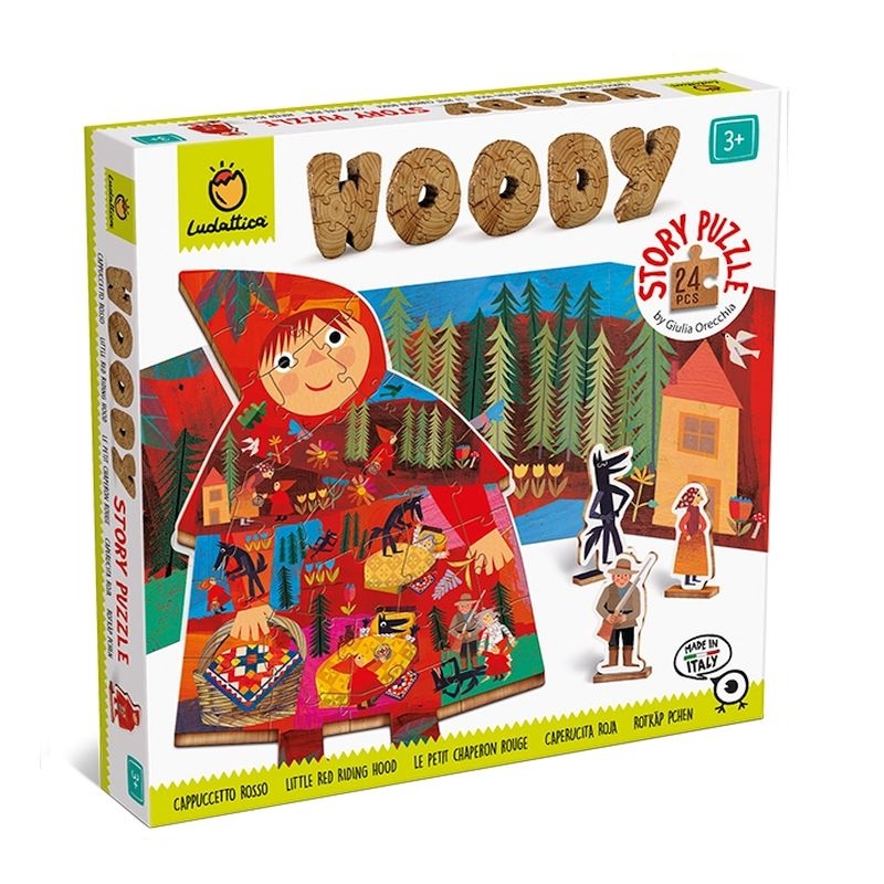 Τα «Woody Story Puzzles», η νέα προσθήκη της Ludattica στα αγαπημένα μας «Woody Puzzles», υιοθετούν την ίδια πρωτότυπη λογική και ενσωματώνουν σε αυτήν και το παιχνίδι μέσω εξιστόρησης ενός παραμυθιού. Συμπεριλαμβανόμενα στα 24 κομμάτια που συνθέτουν την εικόνα του παζλ, κρύβονται και οι 5 βασικοί πρωταγωνιστές της ιστορίας της Κοκκινοσκουφίτσας. Αφού φτιάξετε το παζλ, αφαιρέστε τους, τοποθετήστε τους στις ειδικές βάσεις τους, στήστε το σκηνικό που περιλαμβάνεται στη συσκευασία και αρχίστε την αφήγηση!