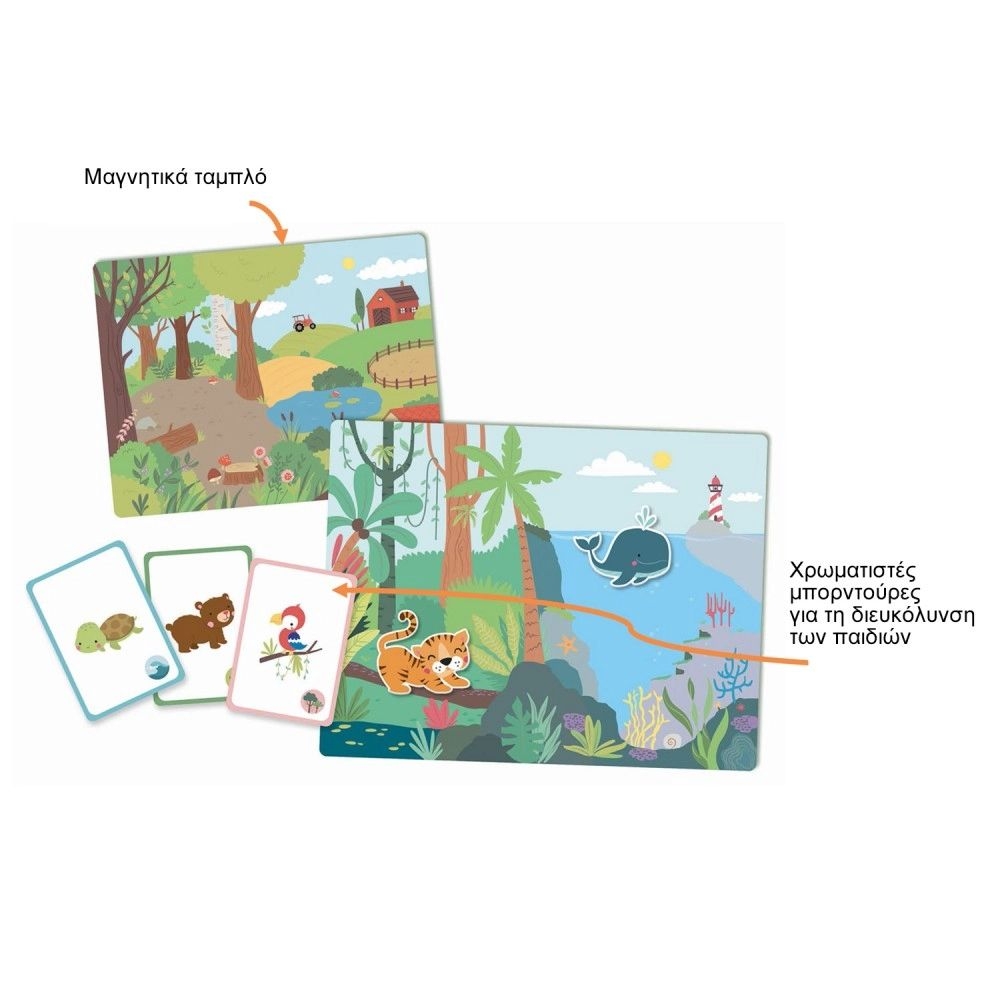 Χρησιμοποιήστε τους μαγνήτες και τα ταμπλό που βρίσκονται στη συσκευασία, για να δημιουργήσετε μοναδικές σκηνές και να βοηθήσετε τα παιδιά να γνωρίσουν τα διάφορα ζωάκια, καθώς ταυτόχρονα εξασκούν τις λεπτές κινητικές τους δεξιότητες αλλά και τις γλωσσικές τους ικανότητες. Οι 20 κάρτες είναι διπλής όψεως και μπορούν να βοηθήσουν τα μικρά παιδιά να αναγνωρίσουν τα ζωάκια που απεικονίζονται, και να τα αντιστοιχίσουν στο φυσικό τους περιβάλλον.