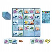 Περιλαμβάνει: 1 κάρτα υποβρύχιο, 36 κάρτες θαλάσσια ζώα, 20 πιόνια δύτης, 4 πιόνια σκορ, 6 κομμάτια παζλ (Ταμπλό παιχνιδιού) και οδηγίες στα ελληνικά.