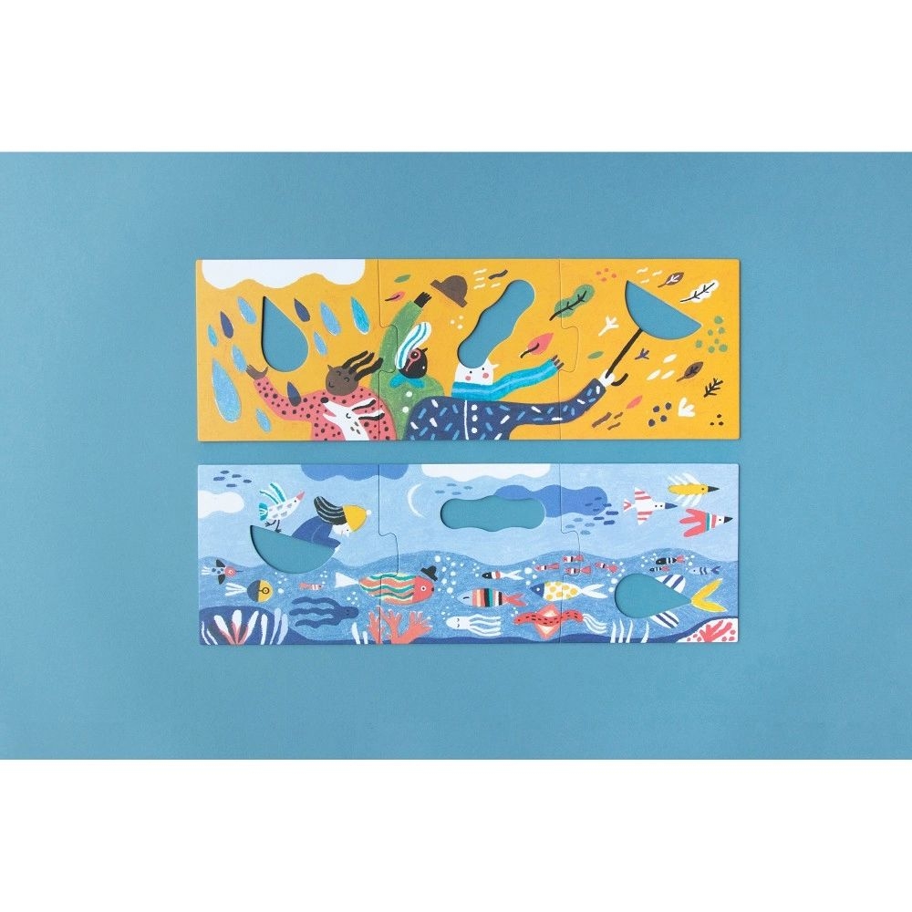 Το παζλ αποτελείται από 4 διαφορετικά παζλ 3 κομματιών καθώς και 3 σφηνωμάτων για να σας βοηθήσουν στη παραγωγή ιστοριών. Τα 3 σφηνώματα ταιριάζουν και στα 4 παζλ.
