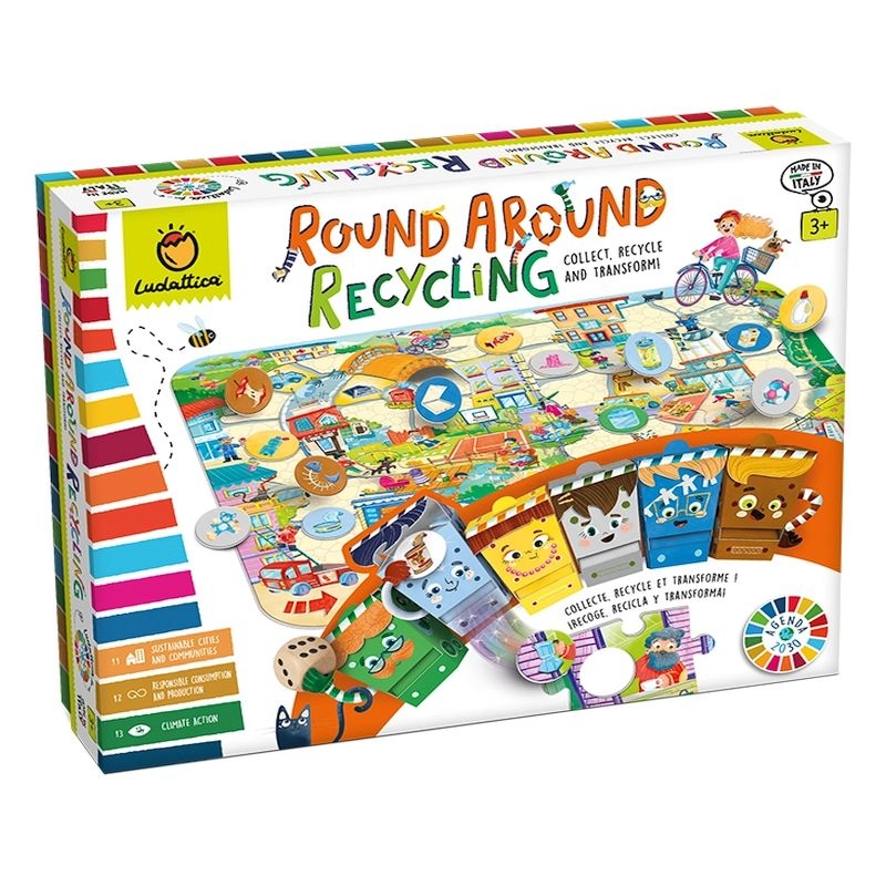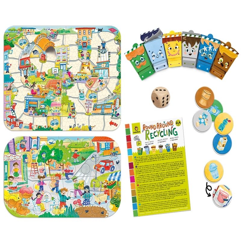 Το «Round Around Recycling» μαθαίνει στα παιδιά τη σημασία και τη μαγεία της ανακύκλωσης! Χρησιμοποιείστε τους ειδικούς κάδους και μετατρέψτε τα απορρίμματα σε πολύτιμα νέα αντικείμενα και υλικά. Το ιδανικό επιτραπέζιο για να βοηθήσετε τα παιδιά να αναπτύξουν, παράλληλα με τη λογική σκέψη τους, και τη περιβαλλοντική τους ευαισθησία.