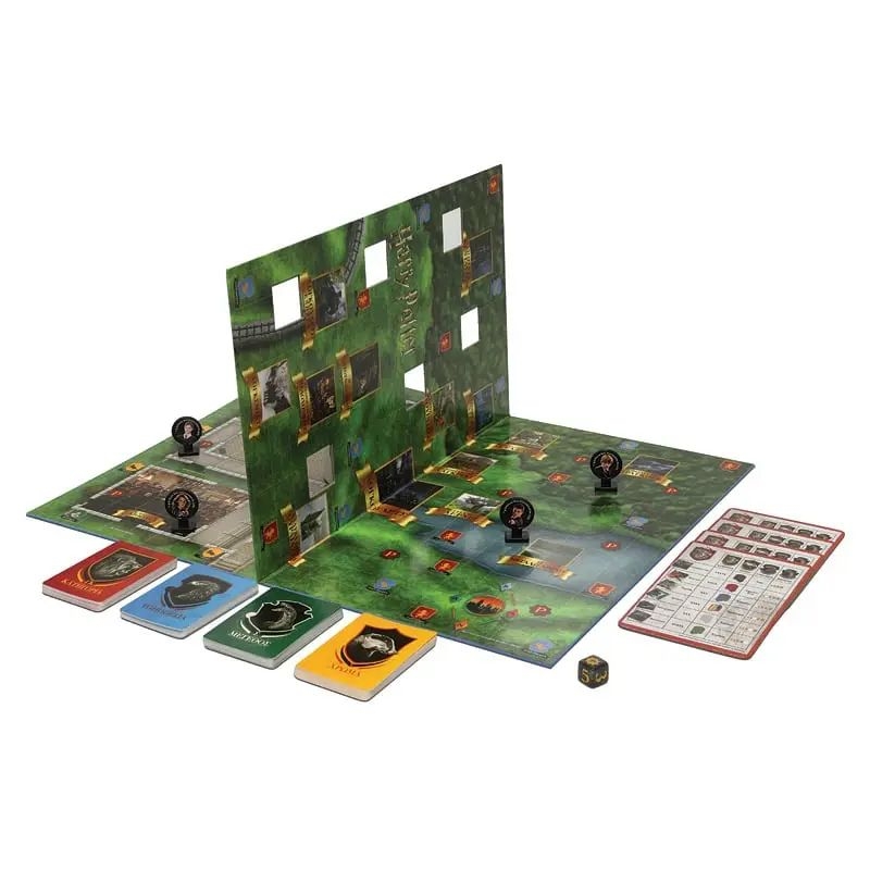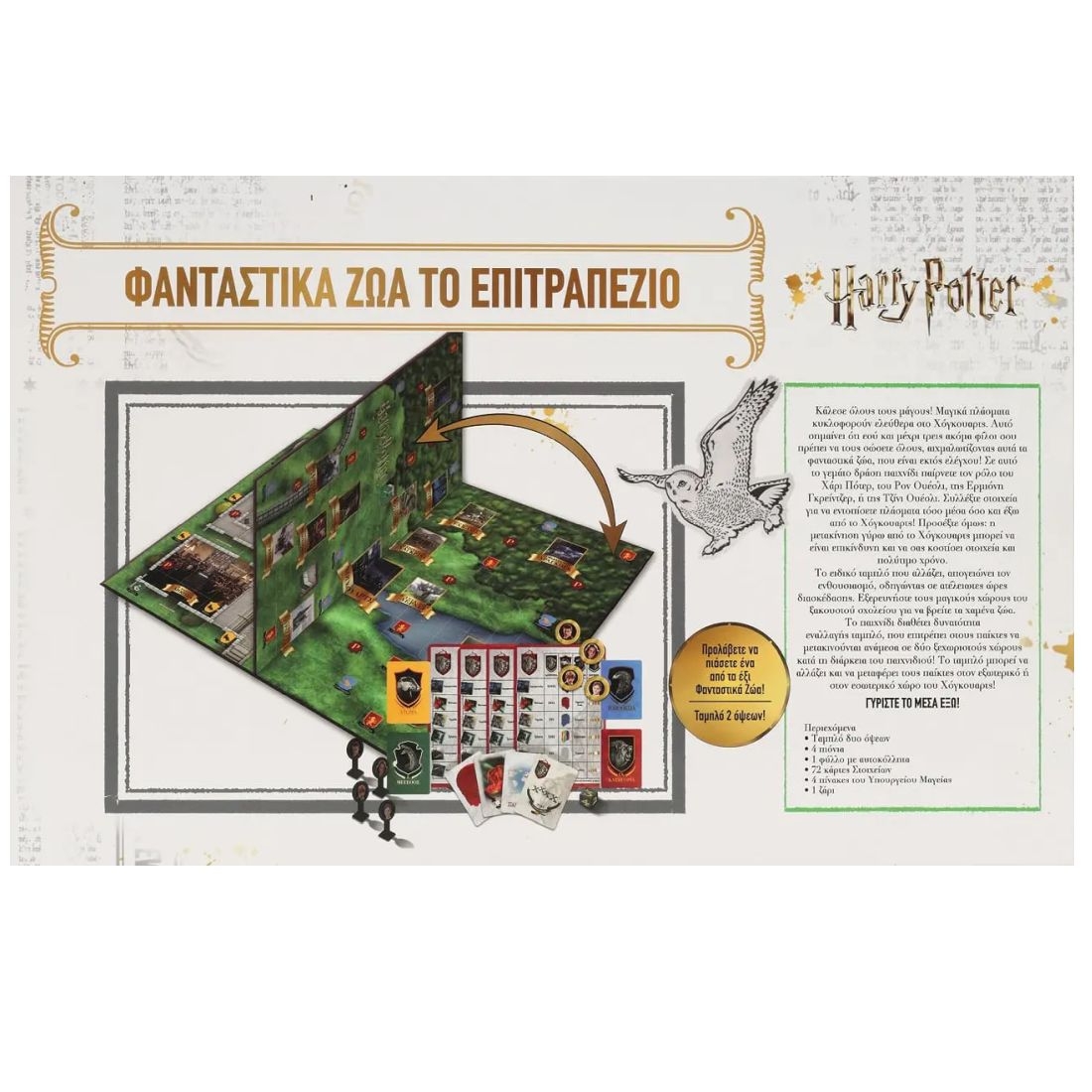 Περιεχόμενα: 1 ταμπλό (2όψεων), 4 πιόνια, 1 φύλλο με αυτοκόλλητα, 72 κάρτες στοιχείων, 4 πίνακες του Υπουργείου Μαγείας, 1 ζάρι και κανόνες.