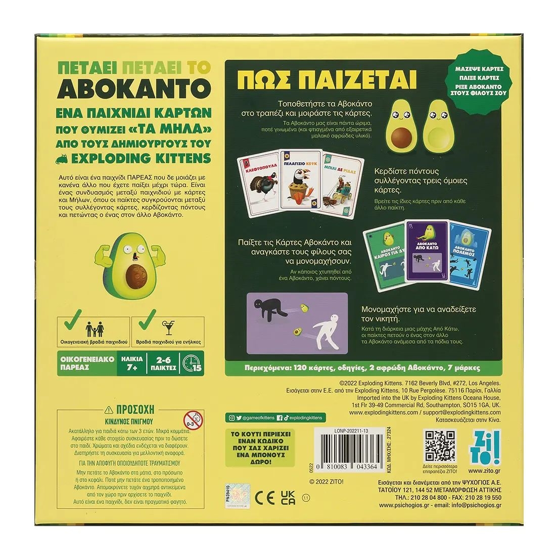 Περιεχόμενα: 120 κάρτες, 2 αφρώδη αβοκάντο, 7 μάρκες και κανόνες.