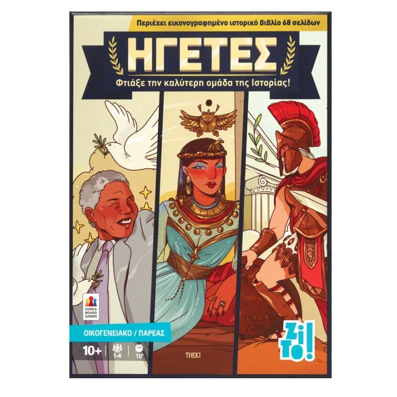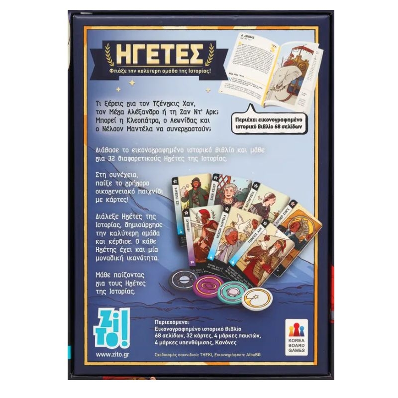 Τι ξέρεις για τον Τζένγκις Χαν, τον Μέγα Αλέξανδρο ή τη Ζαν Ντ’ Αρκ; Μπορεί η Κλεοπάτρα, ο Λεωνίδας και ο Νέλσον Μαντέλα να συνεργαστούν; Διάβασε το εικονογραφημένο ιστορικό βιβλίο και γνώρισε 32 διαφορετικούς Ηγέτες της Ιστορίας. Έπειτα, παίξε το γρήγορο οικογενειακό παιχνίδι με κάρτες! Διάλεξε Ηγέτες της Ιστορίας, δημιούργησε την καλύτερη ομάδα και κέρδισε. Ο κάθε Ηγέτης έχει και μία μοναδική ικανότητα. Μάθε παίζοντας για τους Ηγέτες της Ιστορίας.