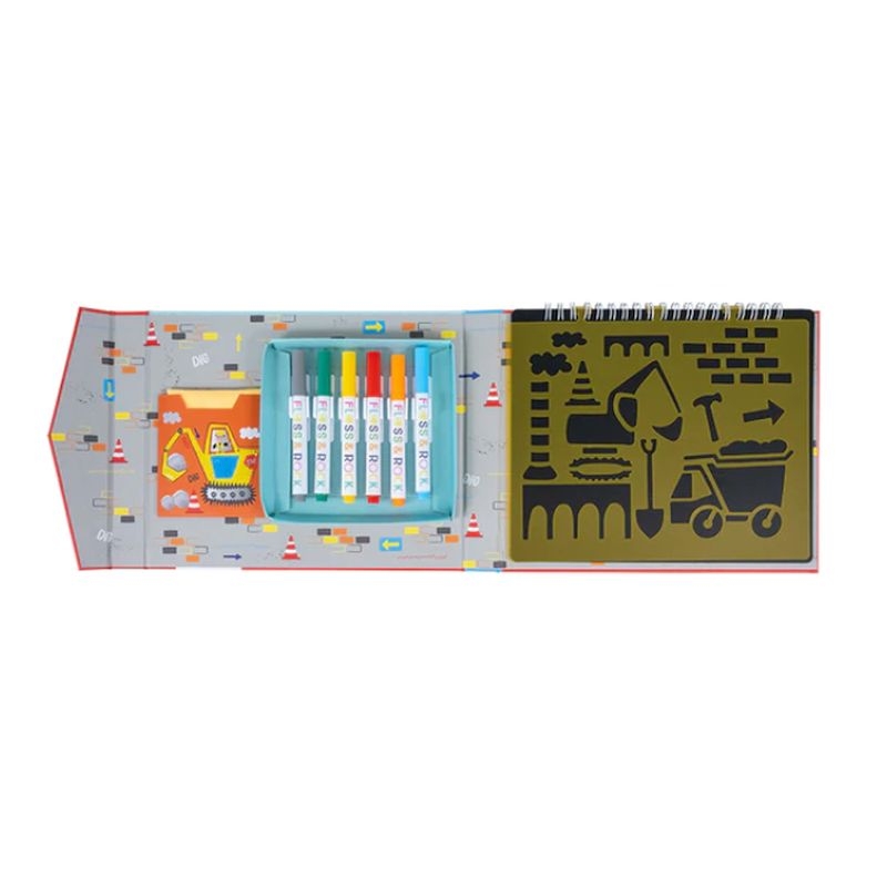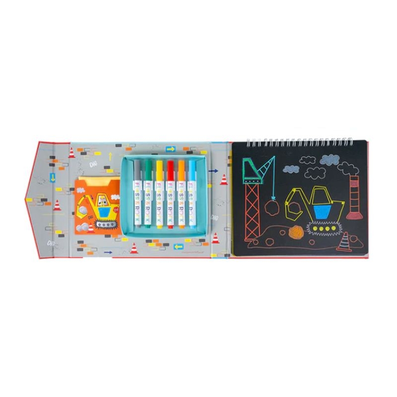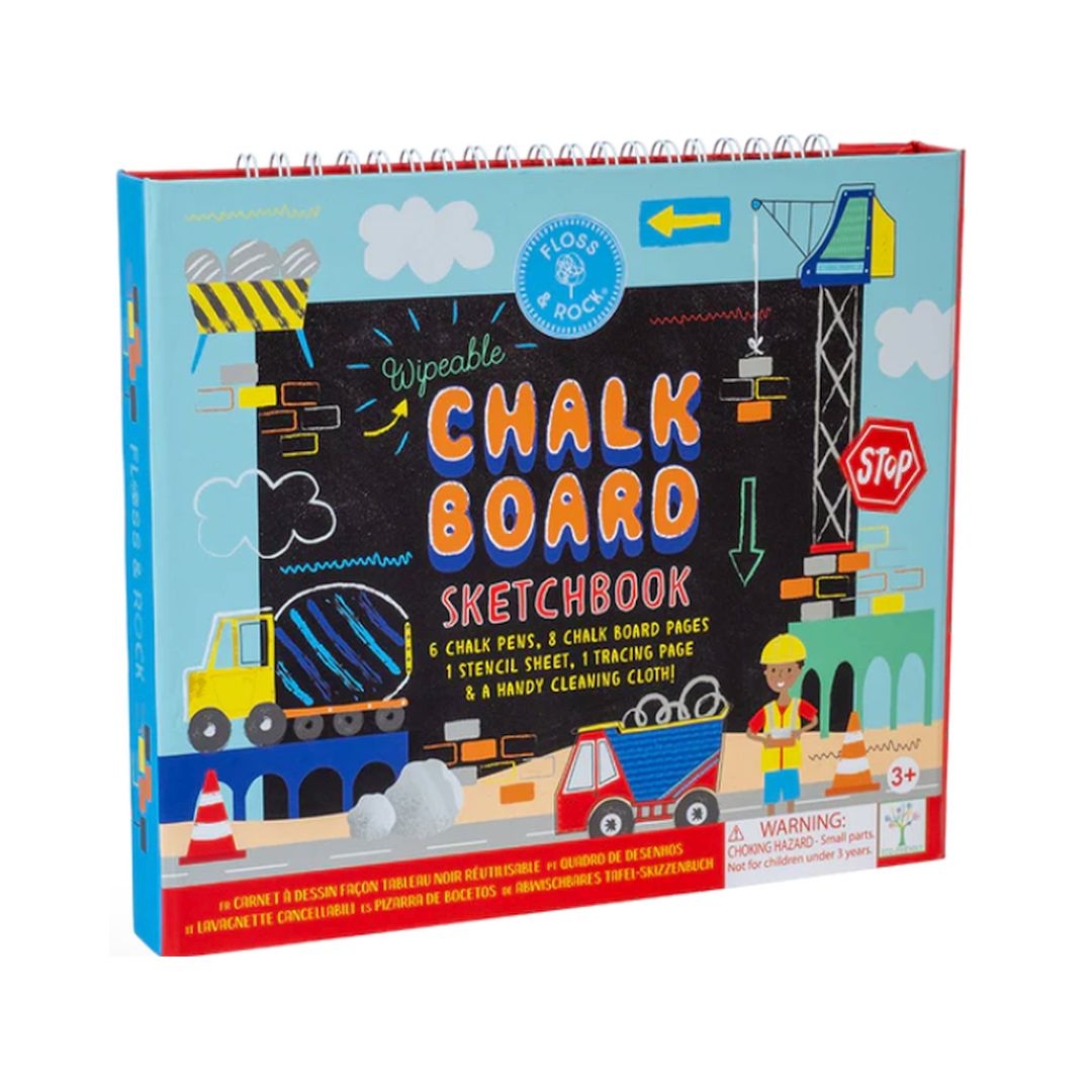 Διασκεδαστική σανίδα κιμωλίας σε μορφή βιβλίου σκίτσων που μπορεί να σκουπιστεί! Αυτό το υπέροχο βιβλίο σκίτσων Chalk Board περιέχει 8 σελίδες. Οι 5 σελίδες με έτοιμες για έγχρωμες εικονογραφήσεις, συν 3 απλές σελίδες έτοιμες για ελεύθερο σχέδιο! Υπάρχει επίσης ένα φύλλο χάραξης (ριζόχαρτο) και ένα σούπερ φύλλο στένσιλ με θέμα το εργοτάξιο. Και τα δύο αυτά φύλλα μπορούν να αφαιρεθούν και να κουμπωθούν στη σπειροειδή βιβλιοδεσία όπου κι αν επιλέξετε! Το βιβλίο σκίτσων συνοδεύεται από 6 χρωματιστά στυλό κιμωλίας και ένα εύχρηστο πανί καθαρισμού για να σκουπίζετε τις σελίδες όταν τελειώσετε, έτοιμοι να ξεκινήσετε ξανά και να συνεχίσετε την επόμενη φορά! Οι σελίδες εκτυπώνονται με φυτικά μελάνια και όλο το χαρτί, η κάρτα, το πλαστικό και το μέταλλο είναι ανακυκλώσιμα.