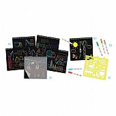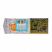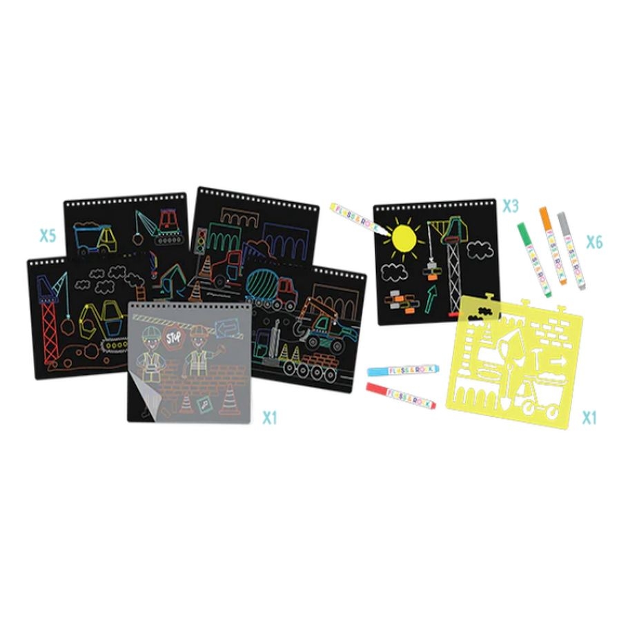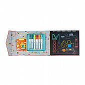 Περιλαμβάνει: 8 σελίδες, συν ένα αφαιρούμενο φύλλο χάραξης (ριζόχαρτο) και στένσιλ, 6 στυλό με κιμωλία + ένα εύχρηστο πανί καθαρισμού