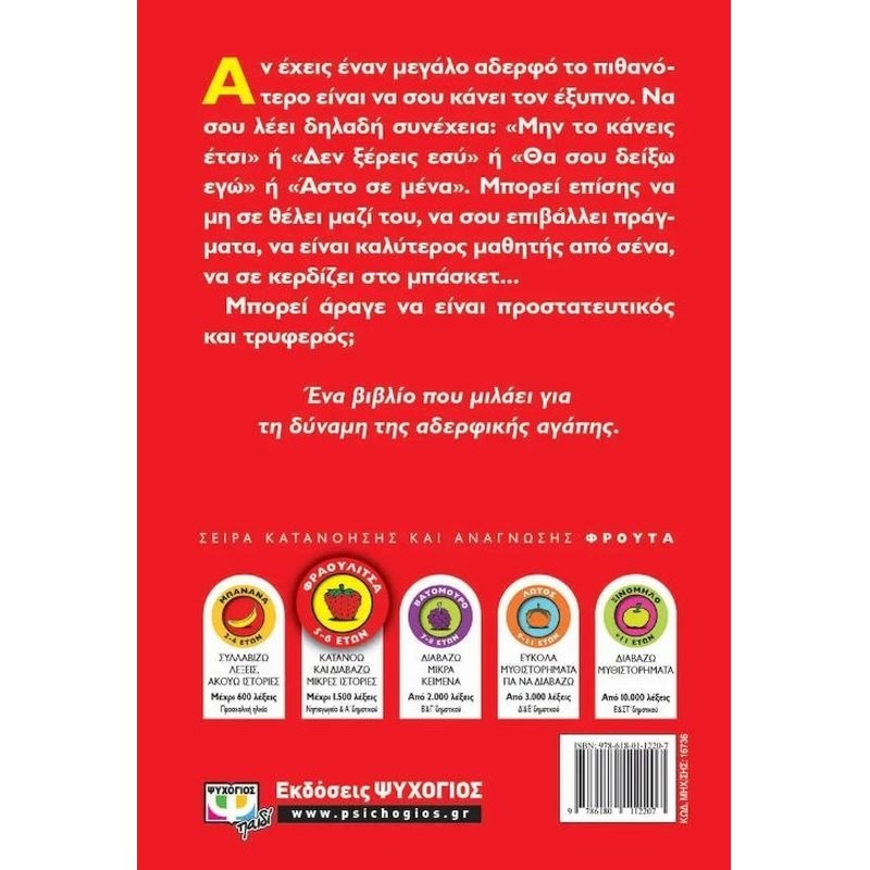 Αν έχεις έναν μεγάλο αδερφό, το πιθανότερο είναι να σου κάνει τον έξυπνο. Να σου λέει δηλαδή συνέχεια: «Μην το κάνεις έτσι», ή «Δεν ξέρεις εσύ», ή «Θα σου δείξω εγώ», ή «Άσ’ το σε μένα». Μπορεί επίσης να μη σε θέλει μαζί του, να σου επιβάλλει πράγματα, να είναι καλύτερος μαθητής από σένα, να σε κερδίζει στο μπάσκετ...Μπορεί, άραγε, να είναι προστατευτικός και τρυφερός; Ένα βιβλίο που μιλάει για τη δύναμη της αδερφικής αγάπης.