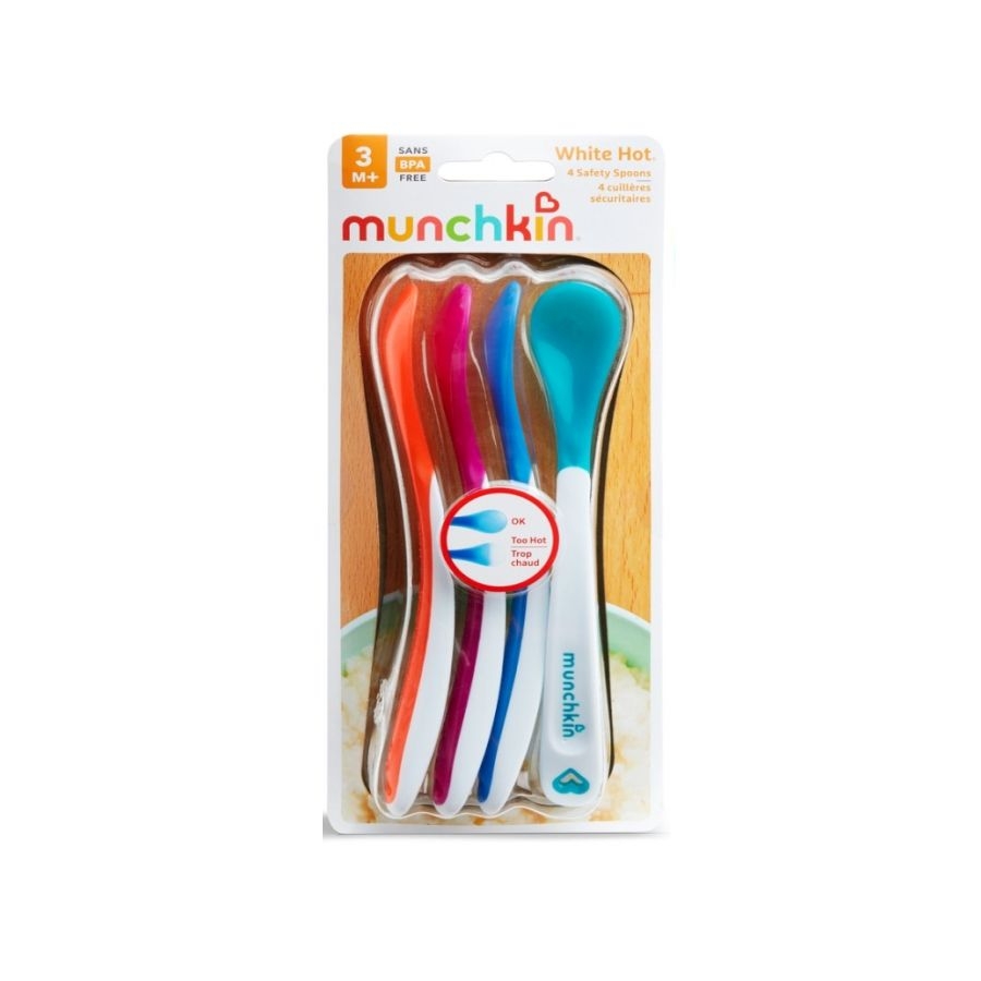 Ταΐστε το μωρό σας με ασφάλεια, με αυτά τα τέσσερα κουτάλια που σας ενημερώνουν όταν το φαγητό είναι πολύ ζεστό. Είναι διασκεδαστικό, αλλά και δύσκολο μερικές φορές να υπολογίσετε πότε το φαγητό είναι πολύ ζεστό, πολύ κρύο ή έχει τη σωστή θερμοκρασία. Τα καινοτόμα κουτάλια ασφαλείας White Hot® της Munchkin θα βοηθήσουν εσάς και το μωρό σας να απολαύσετε τα πρώτα του γεύματα. Βυθίστε, απλώς, το άκρο του κουταλιού στο πολτοποιημένο φαγητό του μωρού σας για να ελέγξετε αν είναι πολύ ζεστό. Αν το χρώμα του άκρου αλλάξει σε λευκό, το φαγητό είναι πολύ ζεστό για το μωρό σας. Περιμένετε να κρυώσει, βυθίστε το ξανά και, αν το άκρο δεν γίνεται λευκό, είστε έτοιμοι! Μπορείτε να ταΐσετε το μωρό σας χωρίς να ανησυχείτε.