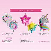 Περιλαμβάνει: 2 μπαλόνια διαμέτρου 32 εκ., 2 μπαλόνια διαστάσεων 40x40 εκ., 1 μπαλόνι μονόκερο 70x37 εκ., 1 tape και 1 καλαμάκι.