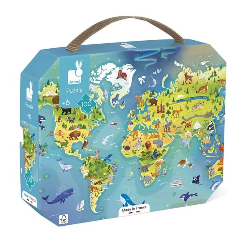 Από τη Νέα Υόρκη στο Χονγκ Κονγκ, ταξιδέψτε στη Γη για να γνωρίσετε τα ζώα και τα θαύματα του πλανήτη μας. Αυτό το υπέροχο παζλ από χαρτόνι 100 τεμαχίων με πολλές λεπτομέρειες είναι ιδανικό για νέους λάτρεις της γεωγραφίας και της περιπέτειας. Το παιδί σας θα αναπτύξει τη μνήμη και την επιδεξιότητά του, με αυτό το όμορφο παζλ από χαρτόνι 100 τεμαχίων. Στην όμορφη μικρή του θήκη, αυτό το παζλ θα είναι εύκολο στη μεταφορά χάρη στην υφασμάτινη λαβή του. Περιέχει μια αφίσα που χρησιμεύει ως πρότυπο για αρχάριους, με τους πιο έμπειρους στη συνέχεια να μπορούν να ολοκληρώσουν μόνοι τους το παζλ.