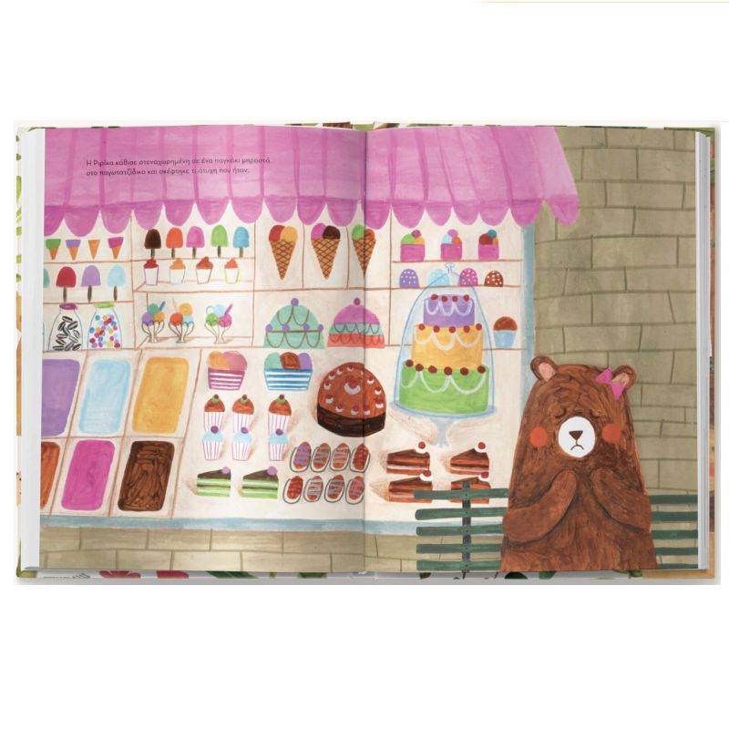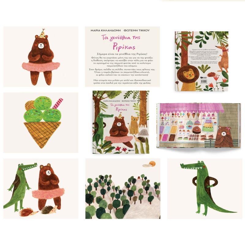 Σήμερα είναι τα γενέθλια της Ριρίκας! Φέτος θα τα γιορτάσει μόνη της και για να της φτιάξει η διάθεση, σκέφτηκε να κατέβει στην πόλη για να φάει το αγαπημένο της παγωτό φιστίκι από το καλύτερο παγωτατζίδικο του κόσμου. Στον δρόμο, σελίδα τη σελίδα, συναντάει τους φίλους της. Όταν η παρέα βρίσκει το παγωτατζίδικο κλειστό, οι φίλοι καλούνται να σώσουν την κατάσταση! Μια ιστορία που μιλάει με απλό και διασκεδαστικό τρόπο στα παιδιά για την τεράστια αξία της φιλίας.