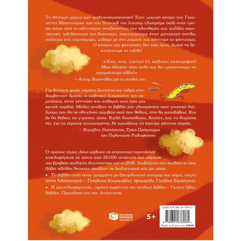 Το δεύτερο μέρος των καλτσοπεριπετειών! Στον μαγικό κόσμο της Γιουστύνα Μπεντνάρεκ και του Ντάνιελ ντε Λατούρ γλιστράμε πάλι στην τρύπα κάτω από το πλυντήριο αναζητώντας την ελευθερία και πολλές περιπέτειες: ταξιδεύουμε στο διάστημα, παρηγορούμε έναν μοναχικό σκύλο, σώζουμε ένα χαμστεράκι, μιλάμε με ένα ρομπότ και κάνουμε το φάντασμα. Ο κόσμος της φαντασίας δεν έχει όρια. Αρκεί να ξεκινήσουμε το ταξίδι! «Χοπ, χοπ, γιούπι! Οι κάλτσες επέστρεψαν! Μας έλειψαν τόσο πολύ και δεν μπορούσαμε να περιμένουμε άλλο!» Άνταμ Βορονόβιτς με τα παιδιά του. «Για δεύτερη φορά, γεμάτες ζωντάνια και τόλμη αναλαμβάνουν δράση: οι κάλτσες! Λατρεύουν την περιπέτεια, είναι γενναίες και καθεμιά τους έχει μια χρυσή καρδιά. Μόλις ανοίξεις το βιβλίο και γλιστρήσεις στον μυστικό διάδρομο που θα σε οδηγήσει ακριβώς εκεί που θέλεις, τότε θα καταλάβεις. Και δε θα θέλεις να γυρίσεις πίσω. Καλή διασκέδαση, λοιπόν, και να θυμάσαι ότι, για να είμαστε ευτυχισμένοι, δε χρειάζεται να έχουμε πάντοτε παρέα». Καταζίνα Στοπάρτσικ, Τρίτο Πρόγραμμα του Πολωνικού Ραδιοφώνου Ο πρώτος τόμος Δέκα κάλτσες σε απίστευτες περιπέτειες κυκλοφόρησε σε πάνω από 25.000 αντίτυπα και σάρωσε στα βραβεία παιδικής λογοτεχνίας για το 2016. Διαβάζεται στα σχολεία κι έχει λάβει πλήθος θετικών σχολίων σε διαδικτυακά και μη μέσα: "Το βιβλίο αυτό είναι γραμμένο με ξεκαρδιστικό χιούμορ και χάρη, χωρίς ίχνος διδακτισμού". Γιούλιους Κουρκιέβιτς, εφημερίδα Γκαζέτα Βιμπόρτσα "Η πιο ενδιαφέρουσα… πρώτη εμφάνιση στο παιδικό βιβλίο". Γιοάνα Όλεχ, Βιβλία. Περιοδικό για την Ανάγνωση.