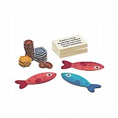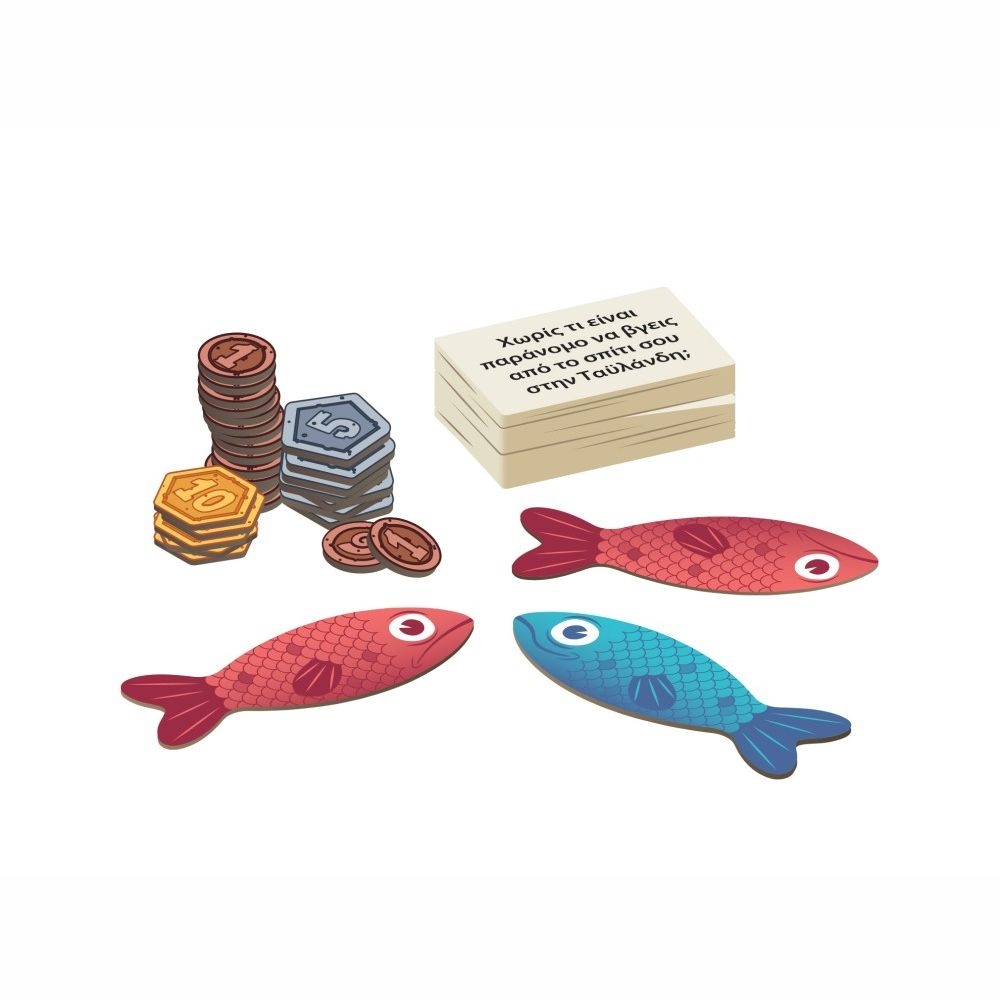 Περιλαμβάνει: 9 ψάρια, 80 μάρκες πόντων, 100 κάρτες ερωτήσεων, 1 κονσερβοκούτι (θήκη), 1 φάκελος κάρτας και οδηγίες.