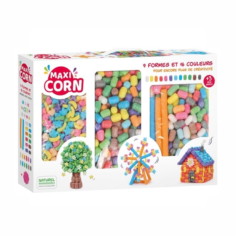 Η συσκευασία Maxi Corn περιέχει σχεδόν 1000 νιφάδες σε 9 σχήματα και 16 διαφορετικά χρώματα για ακόμα μεγαλύτερη δημιουργικότητα! Αυτό το δημιουργικό παιχνίδι αναψυχής είναι προοδευτικό: Τα μικρά μπορούν να ξεκινήσουν ταξινομώντας τα χρώματα και τα σχήματα και κολλώντας τα μεταξύ τους. Αυτό το προοδευτικό παιχνίδι αναψυχής διεγείρει την επιδεξιότητα και την υπομονή και αναπτύσσει την ευκινησία των μικρών χεριών να δημιουργούν θαύματα: τα μικρά θα ξεκινήσουν ταξινομώντας χρώματα ή σχήματα και αργότερα θα διασκεδάσουν δημιουργώντας αγάλματα, κτίρια ή χαρακτήρες χάρη στην κολλώδη δύναμη των μικρών νιφάδες. Για αυτό, δεν χρειάζεται κόλλα, μερικές σταγόνες νερό αρκούν για να κολλήσουν οι νιφάδες μεταξύ τους χάρη στο άμυλο που περιέχουν: είναι φυσικά, ασφαλή και 100% βιοδιασπώμενα.