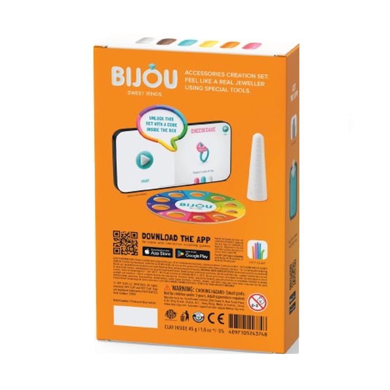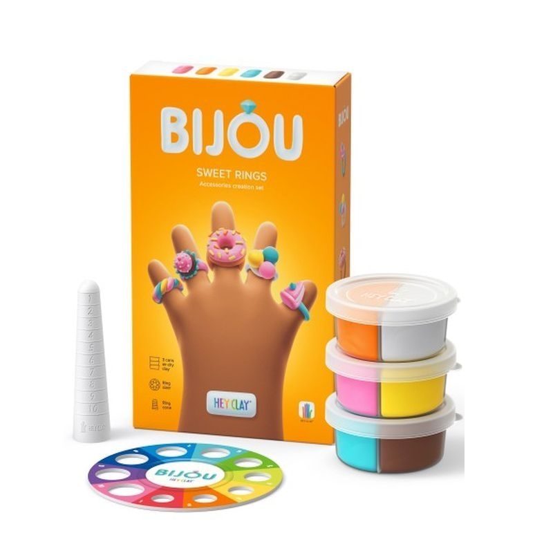 Kατασκευή από πηλό με θέμα Γλυκά Δαχτυλίδια (Sweet Rings) από την συλλογή Bijou. Aφήστε 20 λεπτά το πηλό να σταθεροποιηθεί και μετά από 24 ώρες θα έχει μετατραπεί σε ένα καινούργιο παιχνίδι. Κατεβάστε την εφαρμογή για κινητά και έξυπνες συσκευές για να βρείτε οδηγούς δημιουργίας και διάφορα υπέροχα κινούμενα σχέδια τα οποία θα καθοδηγούν τα παιδιά στο να δημιουργούν ευφάνταστους και πρωτότυπους χαρακτήρες-γλυκά δαχτυλίδια. Η σειρά προϊόντων Hey Clay δημιουργήθηκε για να αναπτύξει τις δεξιότητες των παιδιών και να τα βοηθήσει να να καλλιεργήσουν την δημιουργική τους σκέψη.
