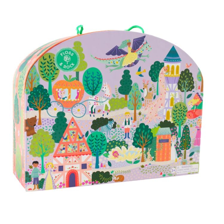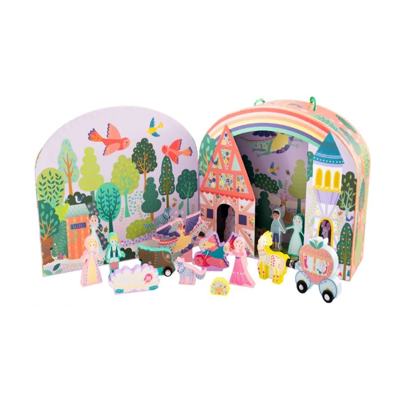 Το κουτί ανοίγει για να αποκαλύψει μια έντονα χρωματισμένη, εικονογραφημένη χώρα των θαυμάτων κάτω από ένα όμορφο φωτεινό ουράνιο τόξο. Ανακαλύψτε τη μυστική περιοχή του κήπου πίσω από το αχυρένιο σπίτι και τον πύργο και μπορεί να συναντήσετε ακόμη και έναν φιλικό δράκο να πετάει ψηλά στον ουρανό! Διασκεδάστε ώρες με πρίγκιπες, πριγκίπισσες, φίλους ζώων και πολλά άλλα. Με 15 ποιοτικά ξύλινα κομμάτια διπλής όψης και δύο σε ρόδες, το διαμορφωμένο επαναχρησιμοποιούμενο κουτί συνοδεύεται από μια εύχρηστη λαβή μεταφοράς που το καθιστά ιδανικό για να το μεταφέρετε από μέρος σε μέρος σε παραμυθένιες περιπέτειες! Όταν τελειώσει ο χρόνος παιχνιδιού, τοποθετήστε όλα τα κομμάτια σας στη βαμβακερή τσάντα με κορδόνια περίσφιξης που παρέχεται για να τα διατηρήσετε ασφαλή για την επόμενη φορά.
