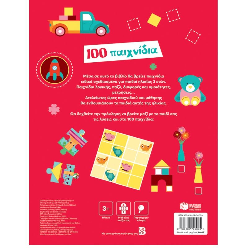 Μέσα σε αυτό το βιβλίο θα βρείτε παιχνίδια ειδικά σχεδιασμένα για παιδιά ηλικίας 3 ετών. Θα μπουν σε λαβύρινθους, να μάθουν να μετρούν και να γράφουν αριθμούς, να ξεχωρίζουν γράμματα και λέξεις, να παίζουν σουντόκου…Ατελείωτες ώρες παιχνιδιού και μάθησης θα ενθουσιάσουν τα παιδιά αυτής της ηλικίας. Θα δεχθείτε την πρόκληση να βρείτε μαζί με το παιδί σας τις λύσεις και στα 100 παιχνίδια;