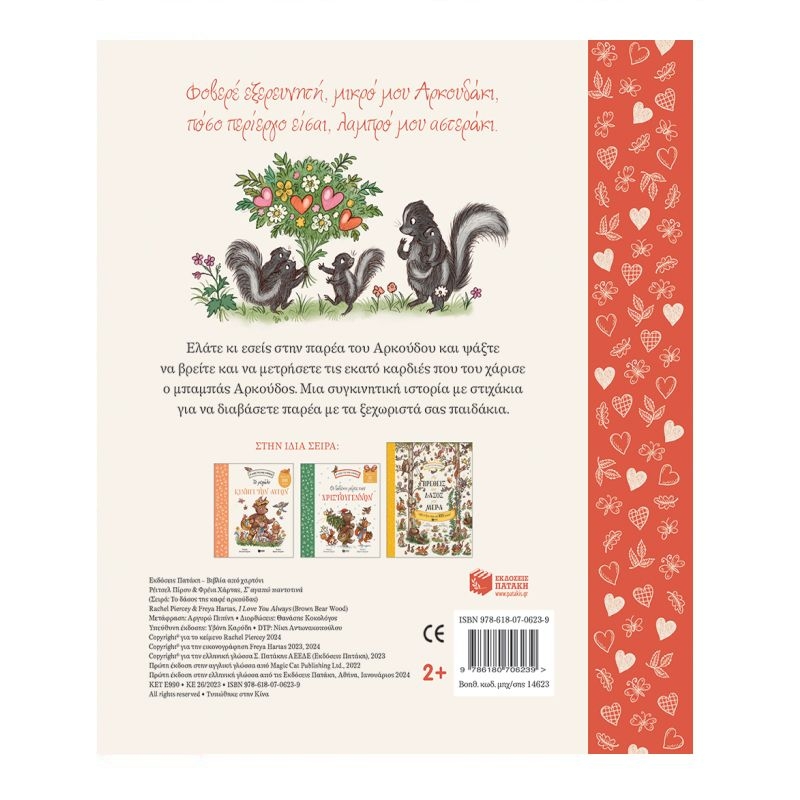 Φοβερέ εξερευνητή, μικρό μου Αρκουδάκι, πόσο περίεργο είσαι, λαμπρό μου αστεράκι. Ελάτε κι εσείς στην παρέα του Αρκούδου και ψάξτε να βρείτε και να μετρήσετε τις εκατό καρδιές που του χάρισε ο μπαμπάς Αρκούδος. Μια συγκινητική ιστορία με στιχάκια για να διαβάσετε παρέα με τα ξεχωριστά σας παιδάκια.