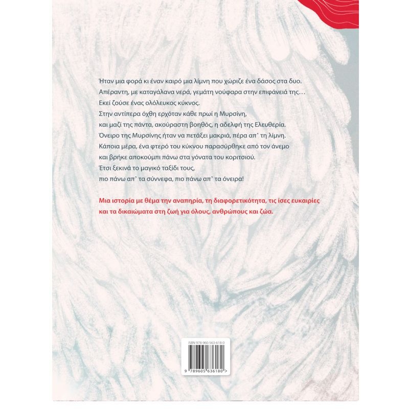 Ήταν μια φορά κι έναν καιρό μια λίμνη που χώριζε ένα δάσος στα δυο. Απέραντη, με καταγάλανα νερά, γεμάτη νούφαρα στην επιφάνειά της… Εκεί ζούσε ένας ολόλευκος κύκνος. Στην αντίπερα όχθη ερχόταν κάθε πρωί η Μυρσίνη, και μαζί της πάντα, ακούραστη βοηθός, η αδελφή της Ελευθερία. Όνειρο της Μυρσίνης ήταν να πετάξει μακριά, πέρα απ’ τη λίμνη. Κάποια μέρα, ένα φτερό του κύκνου παρασύρθηκε από τον άνεμο και βρήκε αποκούμπι πάνω στα γόνατα του κοριτσιού. Έτσι ξεκινά το μαγικό ταξίδι τους, πιο πάνω απ’ τα σύννεφα, πιο πάνω απ’ τα όνειρα!