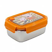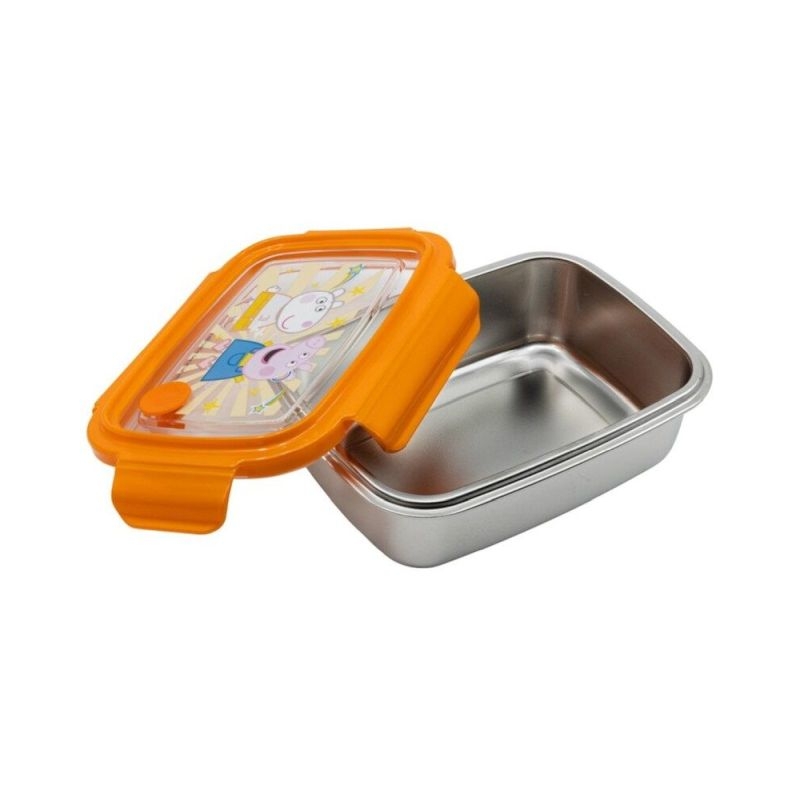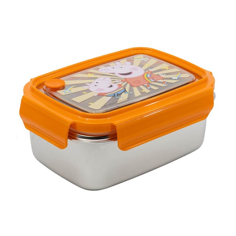 Το δοχείο φαγητού Peppa Pig της εταιρείας Stor είναι κατασκευασμένο από inox, ένα υλικό που το κάνει ελαφρύ, εύκολο στη μεταφορά και ανθεκτικό, δεν είναι όμως κατάλληλο για φούρνο μικροκυμάτων αλλά είναι κατάλληλο για ζέσταμα του φαγητού σε συμβατικό φούρνο αφού αφαιρεθεί το καπάκι. Διαθέτει κλιπς κλεισίματος για μεγαλύτερη στεγανότητα. Είναι εύκολο στο καθάρισμα και έχει βαλβίδα για τον εξαερισμό.