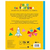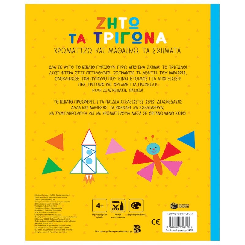 Όλα σε αυτό το βιβλίο γυρίζουν γύρω από ένα σχήμα: το τρίγωνο! Δώσε φτερά στις πεταλούδες, ζωγράφισε τα δόντια του καρχαρία, ολοκλήρωσε τον πύραυλο που είναι έτοιμος για απογείωση! Πες τρίγωνο και φύγαμε για παιχνίδι! Καλή διασκέδαση, παιδιά! Το βιβλίο προσφέρει στα παιδιά ατελείωτες ώρες διασκέδασης αλλά και μάθησης: τα βοηθάει να σχεδιάζουν, να συμπληρώνουν και να χρωματίζουν μέσα σε οργανωμένο χώρο.