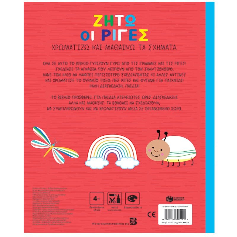 Όλα σε αυτό το βιβλίο γυρίζουν γύρω από τις γραμμές και τις ρίγες! Σχεδίασε τα αγκάθια που λείπουν από τον σκαντζόχοιρο, κάνε τον ήλιο να λάμπει περισσότερο σχεδιάζοντας κι άλλες ακτίνες και χρωμάτισε το ουράνιο τόξο. Πες ρίγες και φύγαμε για παιχνίδι! Καλή διασκέδαση, παιδιά! Πες κύκλος και φύγαμε για παιχνίδι! Καλή διασκέδαση, παιδιά! Καλή διασκέδαση, παιδιά! Το βιβλίο προσφέρει στα παιδιά ατελείωτες ώρες διασκέδασης αλλά και μάθησης: τα βοηθάει να σχεδιάζουν, να συμπληρώνουν και να χρωματίζουν μέσα σε οργανωμένο χώρο.