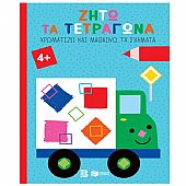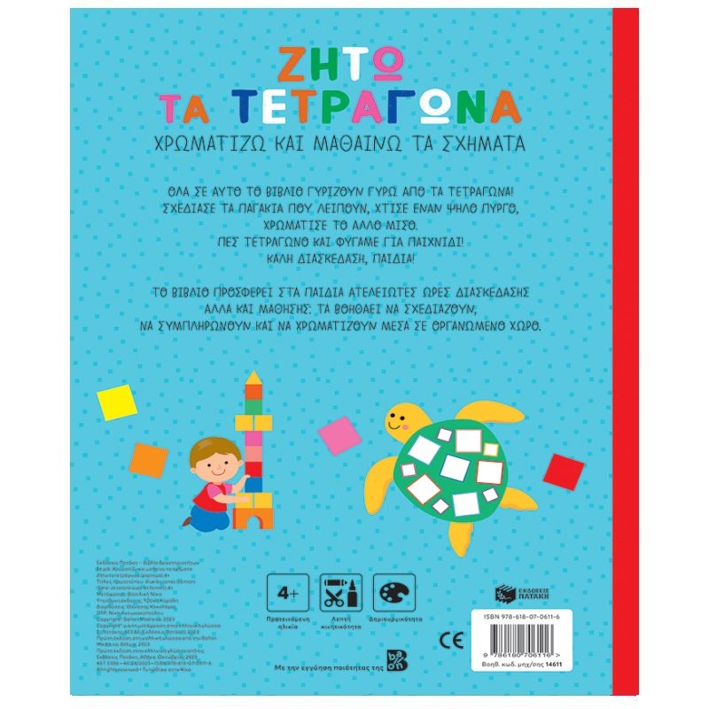 Όλα σε αυτό το βιβλίο γυρίζουν γύρω από τα τετράγωνα! Σχεδίασε τα παγάκια που λείπουν, χτίσε έναν ψηλό πύργο, χρωμάτισε το άλλο μισό. Πες τετράγωνο και φύγαμε για παιχνίδι! Καλή διασκέδαση, παιδιά! Το βιβλίο προσφέρει στα παιδιά ατελείωτες ώρες διασκέδασης αλλά και μάθησης: τα βοηθάει να σχεδιάζουν, να συμπληρώνουν και να χρωματίζουν μέσα σε οργανωμένο χώρο.