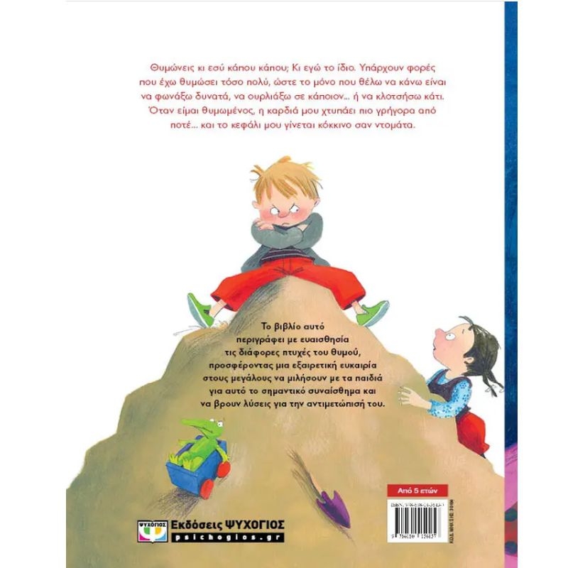 Θυμώνεις κι εσύ κάπου κάπου; Κι εγώ το ίδιο. Υπάρχουν φορές που έχω θυμώσει τόσο πολύ, ώστε το μόνο που θέλω να κάνε είναι να φωνάξω δυνατά, να ουρλιάξω σε κάποιον… ή να κλοτσήσω κάτι… Όταν είμαι θυμωμένος, η καρδιά μου χτυπάει πιο γρήγορα από ποτέ… και το κεφάλι μου γίνεται κόκκινο σαν ντομάτα…Το βιβλίο αυτό περιγράφει με ευαισθησία τις διάφορες πτυχές του θυμού, προσφέροντας μια εξαιρετική ευκαιρία στους μεγάλους να μιλήσουν με τα παιδιά για αυτό το σημαντικό συναίσθημα και να βρουν λύσεις για την αντιμετώπισή του.