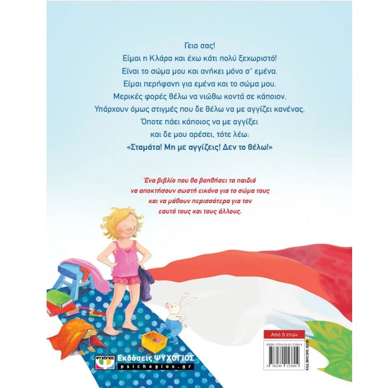 Γεια σας! Είμαι η Κλάρα και έχω κάτι πολύ ξεχωριστό! Είναι το σώμα μου και ανήκει μόνο σ’ εμένα. Είμαι περήφανη για εμένα και το σώμα μου. Μερικές φορές θέλω να νιώθω κοντά σε κάποιον. Υπάρχουν όμως στιγμές που δε θέλω να με αγγίζει κανένας. Όποτε πάει κάποιος να με αγγίξει και δε μου αρέσει, τότε λέω: «Σταμάτα! Μη με αγγίζεις! Δεν το θέλω!» Ένα βιβλίο που θα βοηθήσει τα παιδιά να αποκτήσουν σωστή εικόνα για το σώμα τους και να μάθουν περισσότερα για τον εαυτό τους και τους άλλους.