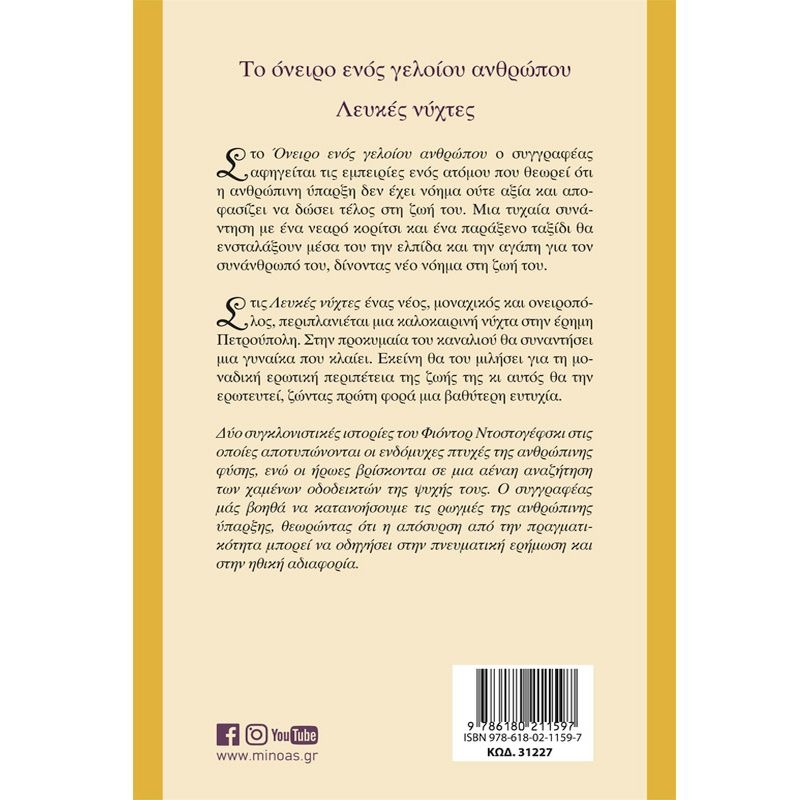 Στο Όνειρο ενός γελοίου ανθρώπου ο συγγραφέας αφηγείται τις εμπειρίες ενός ατόμου που θεωρεί ότι η ανθρώπινη ύπαρξη δεν έχει νόημα ούτε αξία και αποφασίζει να δώσει τέλος στη ζωή του. Μια τυχαία συνάντηση με ένα νεαρό κορίτσι και ένα παράξενο ταξίδι θα ενσταλάξουν μέσα του την ελπίδα και την αγάπη για τον συνάνθρωπό του, δίνοντας νέο νόημα στη ζωή του. Στις Λευκές νύχτες ένας νέος, μοναχικός και ονειροπόλος, περιπλανιέται μια καλοκαιρινή νύχτα στην έρημη Πετρούπολη. Στην προκυμαία του καναλιού θα συναντήσει μια γυναίκα που κλαίει. Εκείνη θα του μιλήσει για τη μοναδική ερωτική περιπέτεια της ζωής της κι αυτός θα την ερωτευτεί, ζώντας πρώτη φορά μια βαθύτερη ευτυχία. Δύο συγκλονιστικές ιστορίες του Φιόντορ Ντοστογέφσκι στις οποίες αποτυπώνονται οι ενδόμυχες πτυχές της ανθρώπινης φύσης, ενώ οι ήρωες βρίσκονται σε μια αέναη αναζήτηση των χαμένων οδοδεικτών της ψυχής τους. Ο συγγραφέας μάς βοηθά να κατανοήσουμε τις ρωγμές της ανθρώπινης ύπαρξης, θεωρώντας ότι η απόσυρση από την πραγματικότητα μπορεί να οδηγήσει στην πνευματική ερήμωση και στην ηθική αδιαφορία.