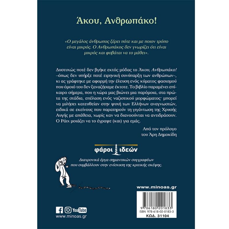 «Ο μεγάλος άνθρωπος ξέρει πότε και με ποιον τρόπο είναι μικρός. Ο Ανθρωπάκος δεν γνωρίζει ότι είναι μικρός και φοβάται να το μάθει». Δυστυχώς ποτέ δεν βγήκε εκτός μόδας το Άκου, Ανθρωπάκο! –όπως δεν υπήρξε ποτέ ειρηνική συνύπαρξη των ανθρώπων–, κι ας γράφτηκε με αφορμή την έλευση ενός κύματος φασισμού που όμοιό του δεν ξαναζήσαμε έκτοτε. Το βιβλίο παραμένει επίκαιρο σήμερα, που η χώρα μας βιώνει μια παρόμοια, στα πρώτα της στάδια, επέλαση ενός ναζιστικού μορφώματος· μπορεί να μιλήσει κατευθείαν στην ψυχή των Ελλήνων αναγνωστών, ειδικά σε εκείνους που παρατηρούν τη γιγάντωση της Χρυσής Αυγής με απάθεια, χωρίς καν να διανοούνται να αντιδράσουν. Ο Ράιχ μοιάζει να το έγραψε (και) για εμάς.