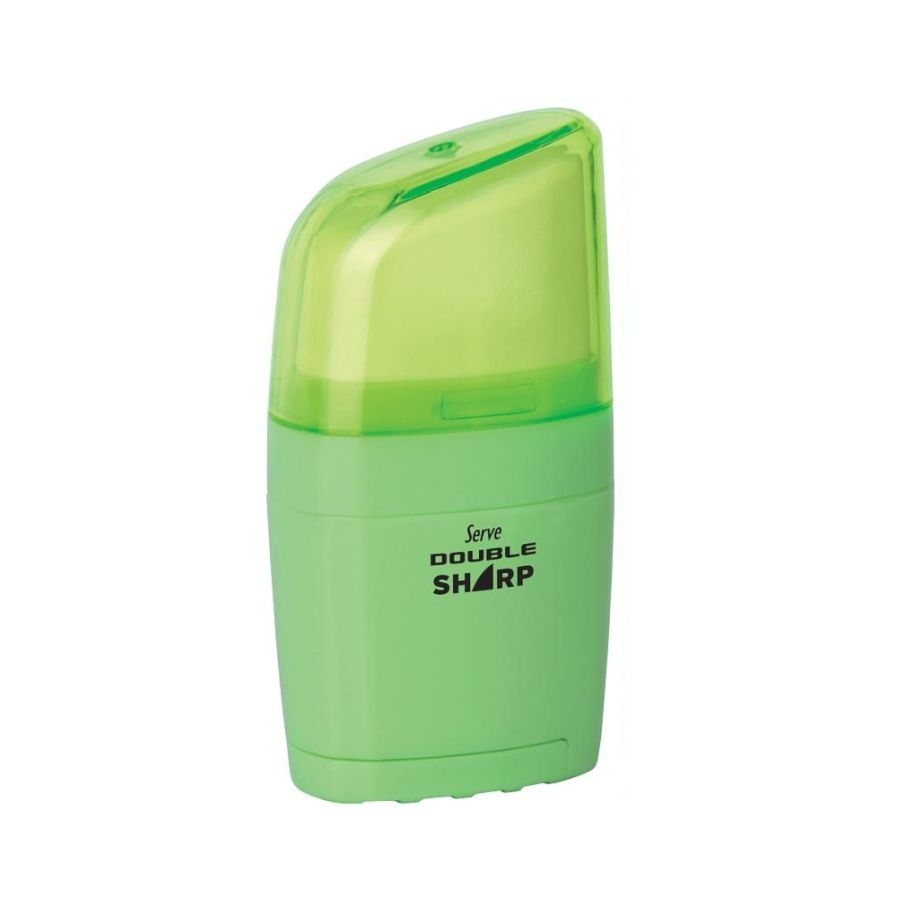 Η Serve double προσφέρει άλλο ένα πρωτοποριακό προϊόν! Σβήστρα και ξύστρα μαζί σε νέο σχεδιασμό. Περιλαμβάνει μια χρωματιστή ξύστρα, στο κάτω μέρος, που ανοίγει με καπάκι και κρατά στο δοχείο της τα ξύσματα και παράλληλα διαθέτει μια μαλακή συνθετική σβήστρα, στο πάνω μέρος, κατάλληλη για πλήθος μολυβιών γραφίτη.