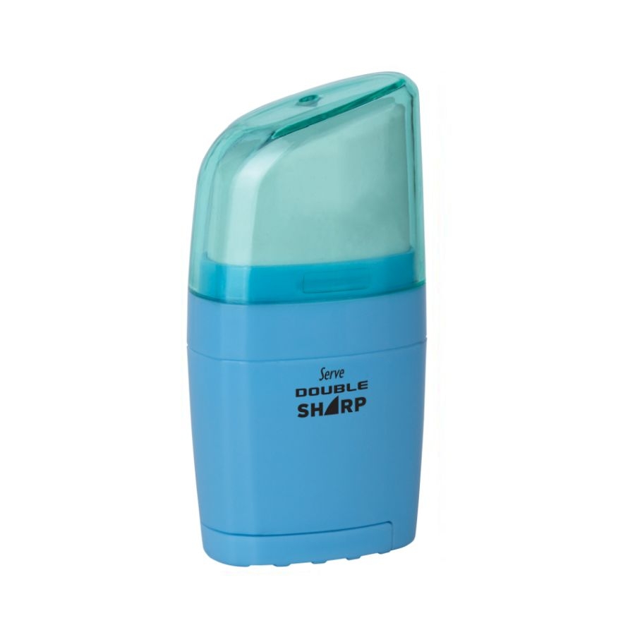 Η Serve double προσφέρει άλλο ένα πρωτοποριακό προϊόν! Σβήστρα και ξύστρα μαζί σε νέο σχεδιασμό. Περιλαμβάνει μια χρωματιστή ξύστρα, στο κάτω μέρος, που ανοίγει με καπάκι και κρατά στο δοχείο της τα ξύσματα και παράλληλα διαθέτει μια μαλακή συνθετική σβήστρα, στο πάνω μέρος, κατάλληλη για πλήθος μολυβιών γραφίτη.