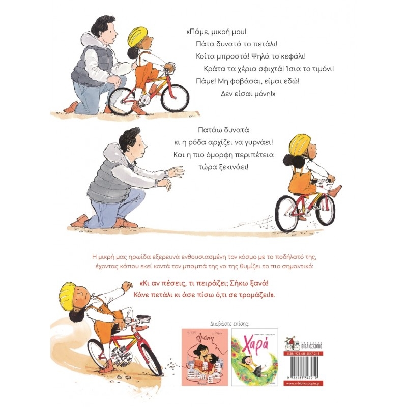 Η μικρή μας ηρωίδα εξερευνά ενθουσιασμένη τον κόσμο με το ποδήλατό της, έχοντας κάπου εκεί κοντά τον μπαμπά της να της θυμίζει το πιο σημαντικό: «Κι αν πέσεις, τι πειράζει; Σήκω ξανά! Κάνε πετάλι κι άσε πίσω ό,τι σε τρομάζει!».