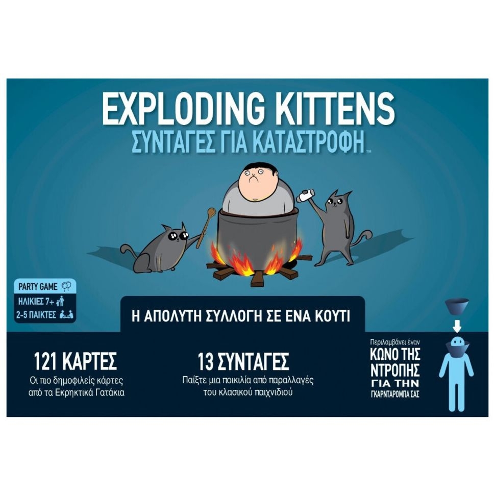 Το Συνταγές για Καταστροφή έχει όλα όσα χρειάζονται οι νέοι παίκτες για να παίξουν την πρώτη τους παρτίδα Εκρηκτικά Γατάκια. Για πιο έμπειρους παίκτες, περιέχει τις καλύτερες κάρτες από όλες τις επεκτάσεις του παιχνιδιού, όπως και Βιβλία Συνταγών που χρησιμοποιούνται για να ξεκλειδώσουν πάνω από μια δωδεκάδα νέους τρόπους για να παίξετε!